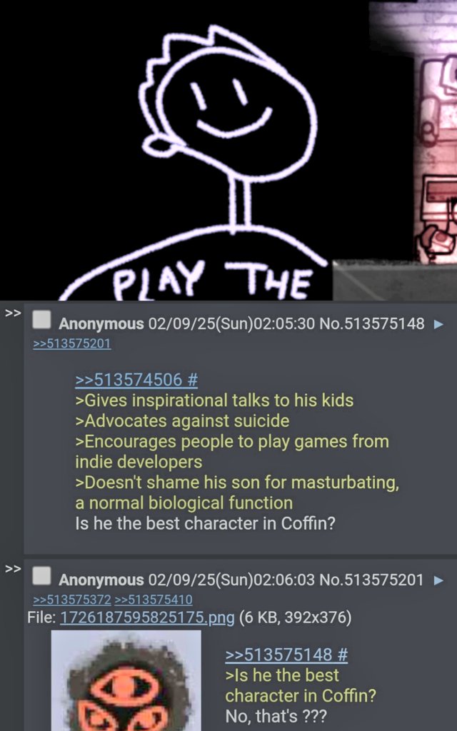 >>561339634You kids are fake fans. When I first found Coffin, I was so obsessed with the game I would fall asleep every night listening to the soundtracks on loop. I did that for a couple months.