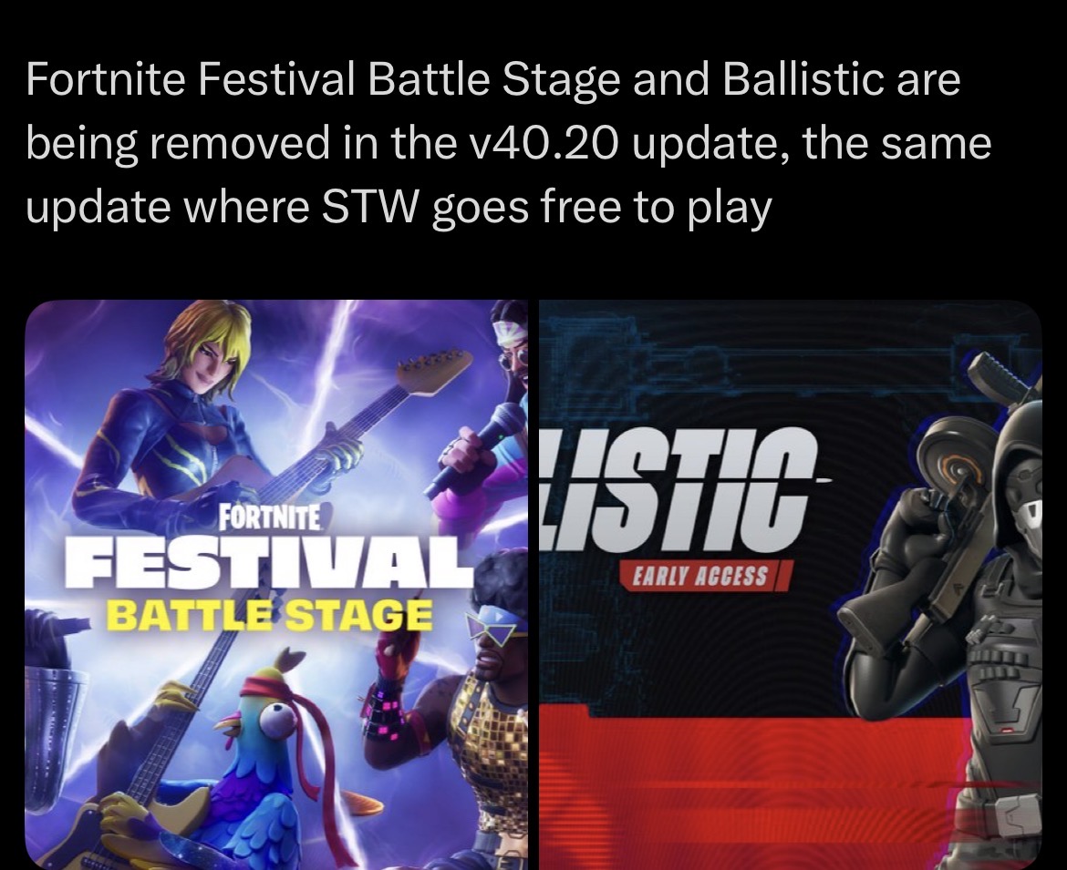>Rocket RacingAfter two years of high-speed competition, Rocket Racing will leave Fortnite along with all UEFN islands built with Rocket Racing templates in October 2026. Starting next week, Rocket Racing Quests will no longer be available, and the current track creation template will be removed from UEFN. There are no further Ranked rewards planned for this season. Nothing changes with your Vehicle Locker and you can still use your customized cars in Fortnite.For developers building car content, in April we’re adding car physics, hazards, and track-building tools (including the Track Spline tool and Speed Boost devices) to the base UEFN toolset. Developers will also be able to build custom racing islands with jumps, boosts, and drifting. Before October, developers will be able to move compatible Rocket Racing content over to standalone UEFN islands.>BallisticBallistic will be removed from Fortnite on April 16, 2026 in the 40.20 release. You can still play and rank up in Ballistic during its final weeks. For developers, first-person shooter tools in UEFN remain available, and FPS creator islands will continue to be supported. In order for developers to build modes like Ballistic, more UEFN features will be required such as custom weapon support, ranked support, and additional matchmaking features.>Festival Battle StageFortnite Festival consists of three music modes: Festival Main Stage (one band with teams of up to 4, playing the "note highway" rhythm game), Festival Jam Stage (social island with casual music emoting), and Festival Battle Stage (a PVP game where 4 teams of 4 players play "note highway" rhythm gameplay competitively).The Battle Stage competitive mode of Festival will go offline on April 16, 2026 with the 40.20 release and Quests will be available until then. Music remains a major part of Fortnite and we'll continue to improve Festival Main Stage and Jam Stage, and the music features that are available everywhere in Fortnite.