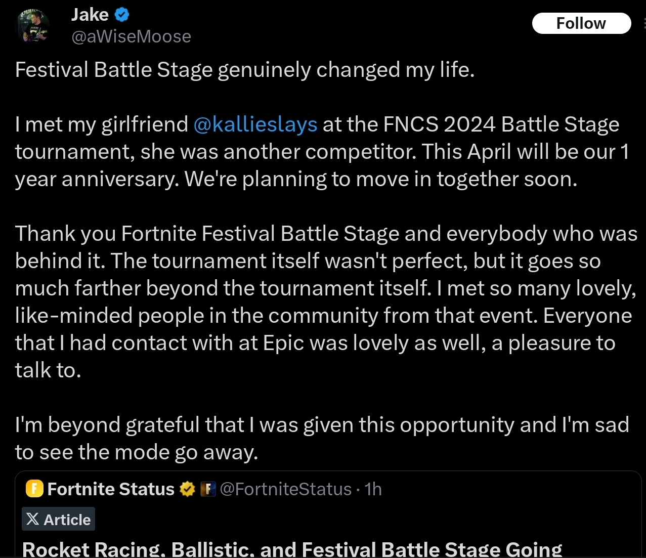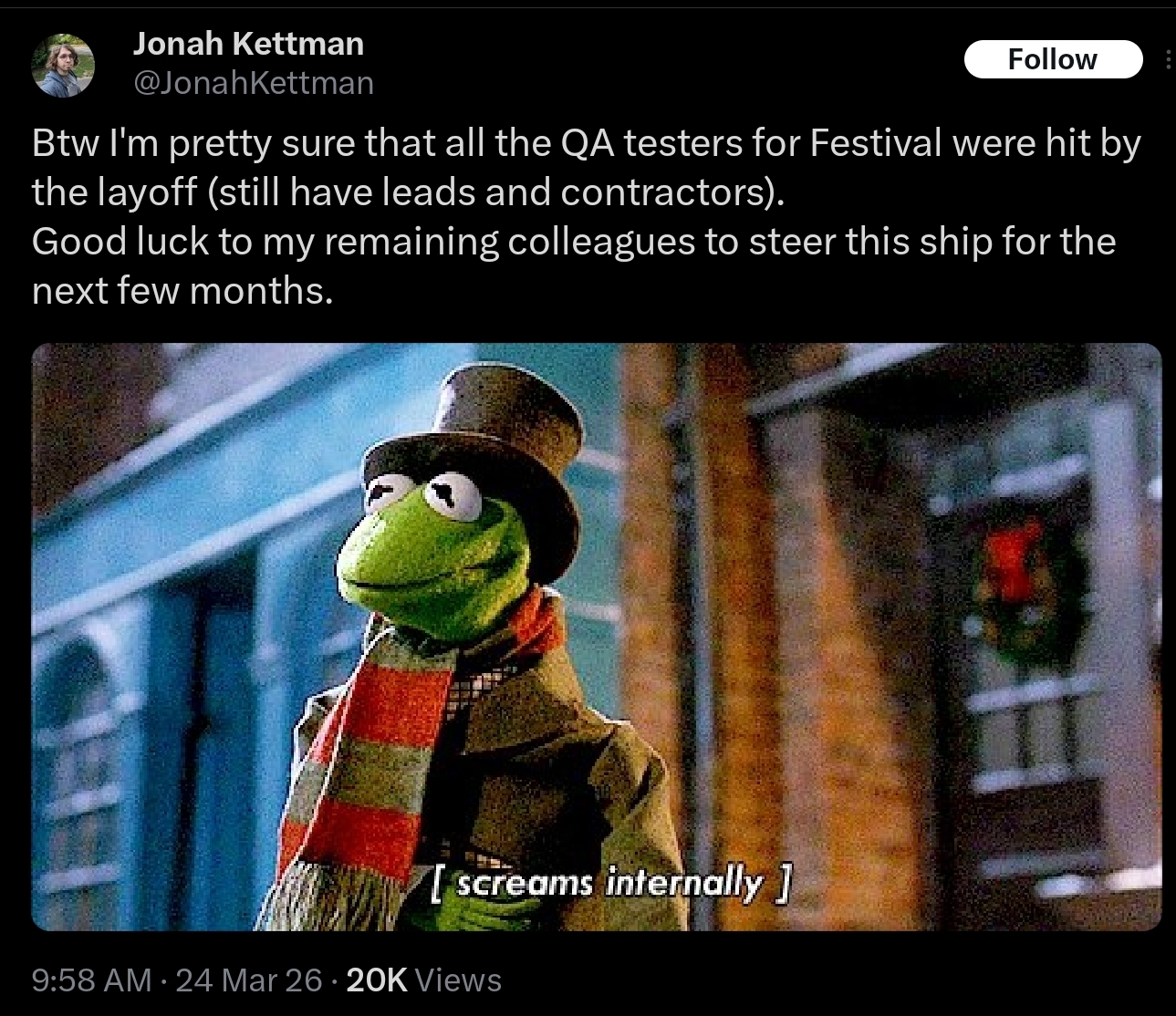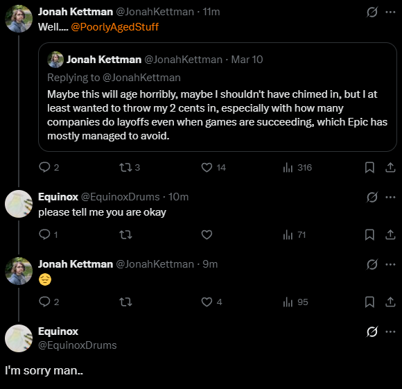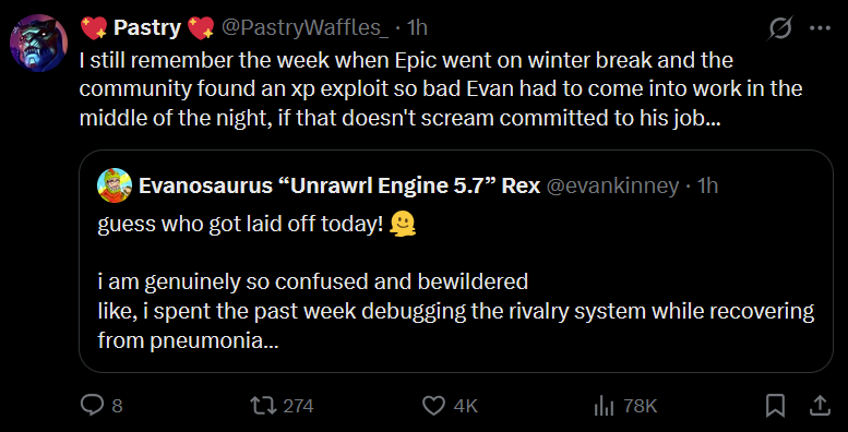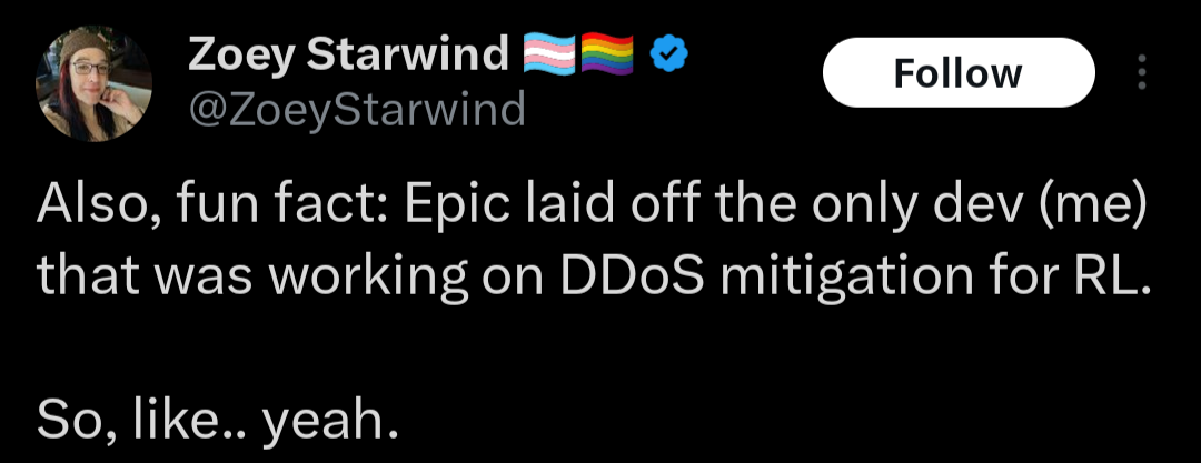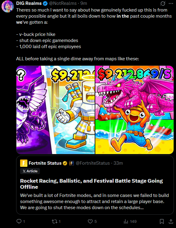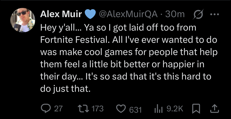 original post>Listen, Epic's expenses and profits are way above my QA pay grade, but here's what I do know:In order to increase profits you either need to raise income or lower expenses. The quickest way to lower expenses is Layoffs, so I'm at least glad to still be around.>This is coming from someone who buys their own vbucks. I know everything sucks right now, games are $80, consoles are $700, groceries are up, so being charged more is never fun. At least Epic isn't doing this so Tim can afford his 12th yacht.>Maybe this will age horribly, maybe I shouldn't have chimed in, but I at least wanted to throw my 2 cents in, especially with how many companies do layoffs even when games are succeeding, which Epic has mostly managed to avoid.he worked on festival playtesting from what i reading, but please read properly, battle stage is the mode getting canned, regular festival is okay