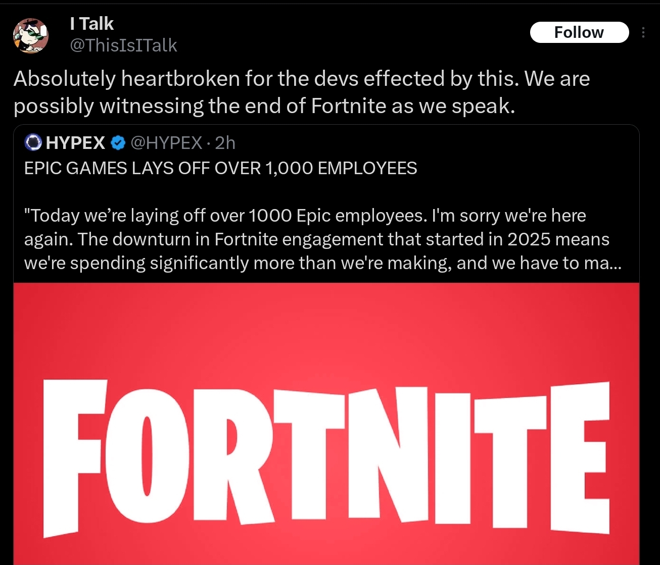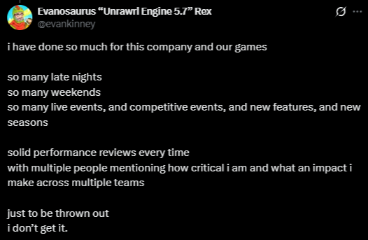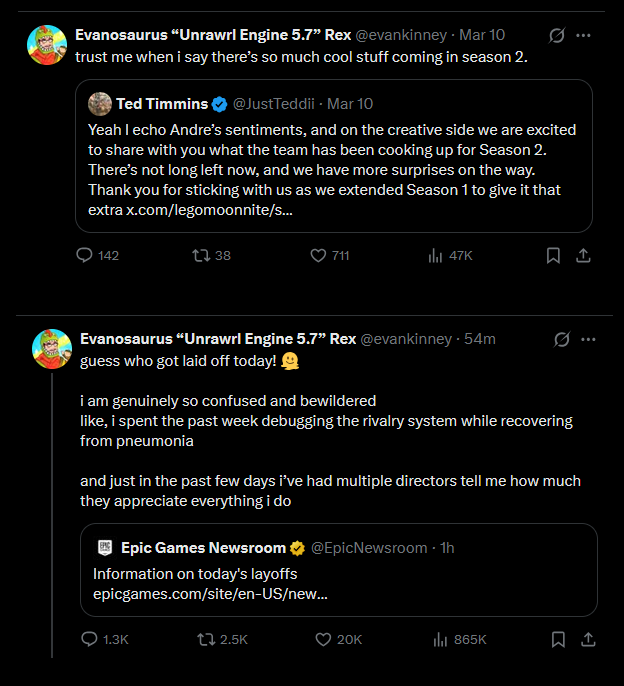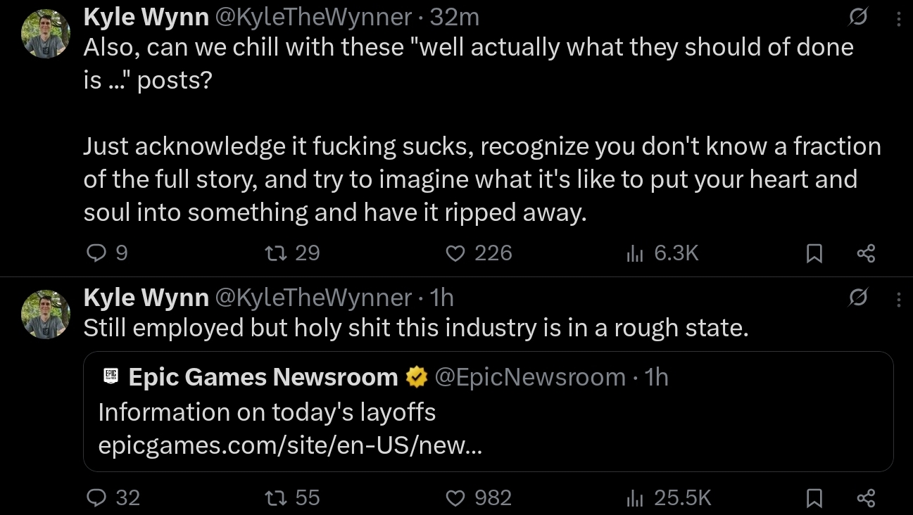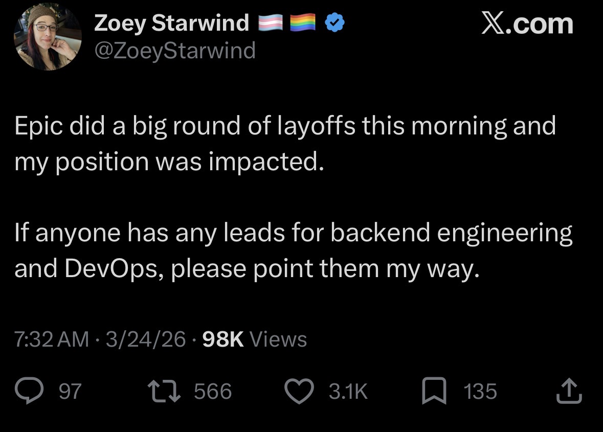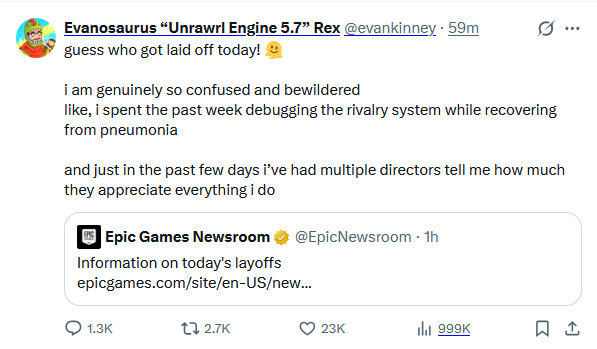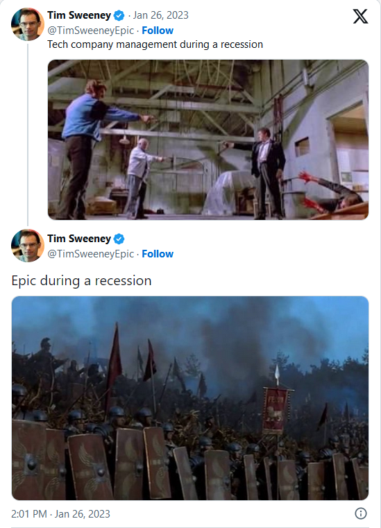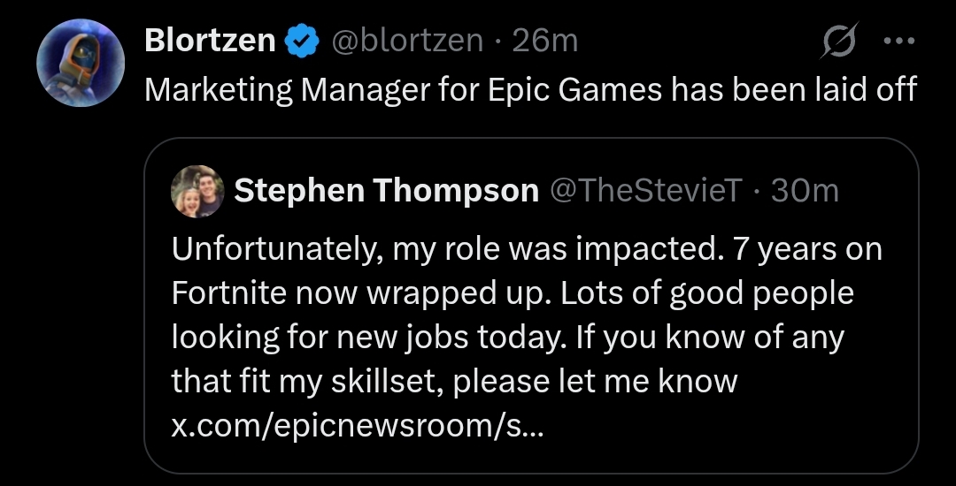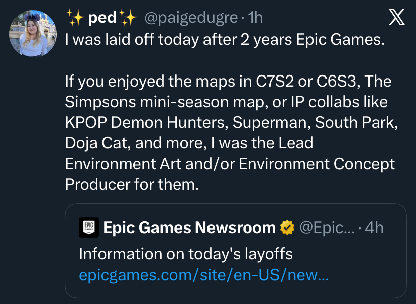 Today we’re laying off over 1000 Epic employees. I'm sorry we're here again. The downturn in Fortnite engagement that started in 2025 means we're spending significantly more than we're making, and we have to make major cuts to keep the company funded. This layoff, together with over $500 million of identified cost savings in contracting, marketing, and closing some open roles puts us in a more stable place. Some of the challenges we're facing are industry-wide challenges: slower growth, weaker spending, and tougher cost economics; current consoles selling less than last generation's; and games competing for time against other increasingly-engaging forms of entertainment. And some of our challenges are unique to Epic. Despite Fortnite remaining one of the most successful games in the world, we’ve had challenges delivering consistent Fortnite magic with every season; we're only in the early stages of returning to mobile and optimizing Fortnite for the world's billions of smartphones; and in being the industry's vanguard we have taken a lot of bullets in a battle which is only in the early days of paying off for ourselves and all developers. Since it's a thing now, I should note that the layoffs aren't related to AI. To the extent it improves productivity, we want to have as many awesome developers developing great content and tech as we can. What we now need to do is clear: build awesome Fortnite experiences with fresh seasonal content, gameplay, story, and live events; accelerate developer tools with greater stability and capability as we evolve from Unreal Engine 5 and UEFN to Unreal Engine 6. And we'll be kicking off the next generation of Epic with huge launch plans towards the end of the year.(1/2)-Tim