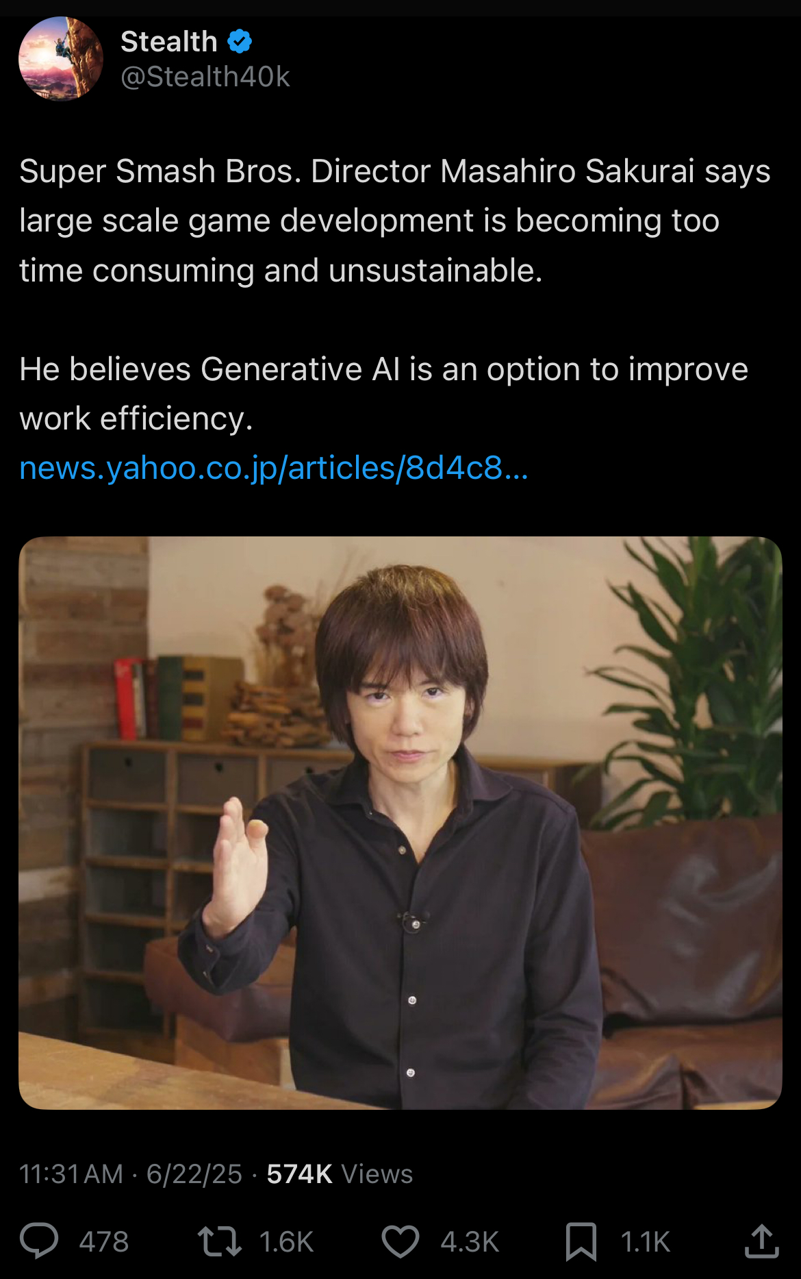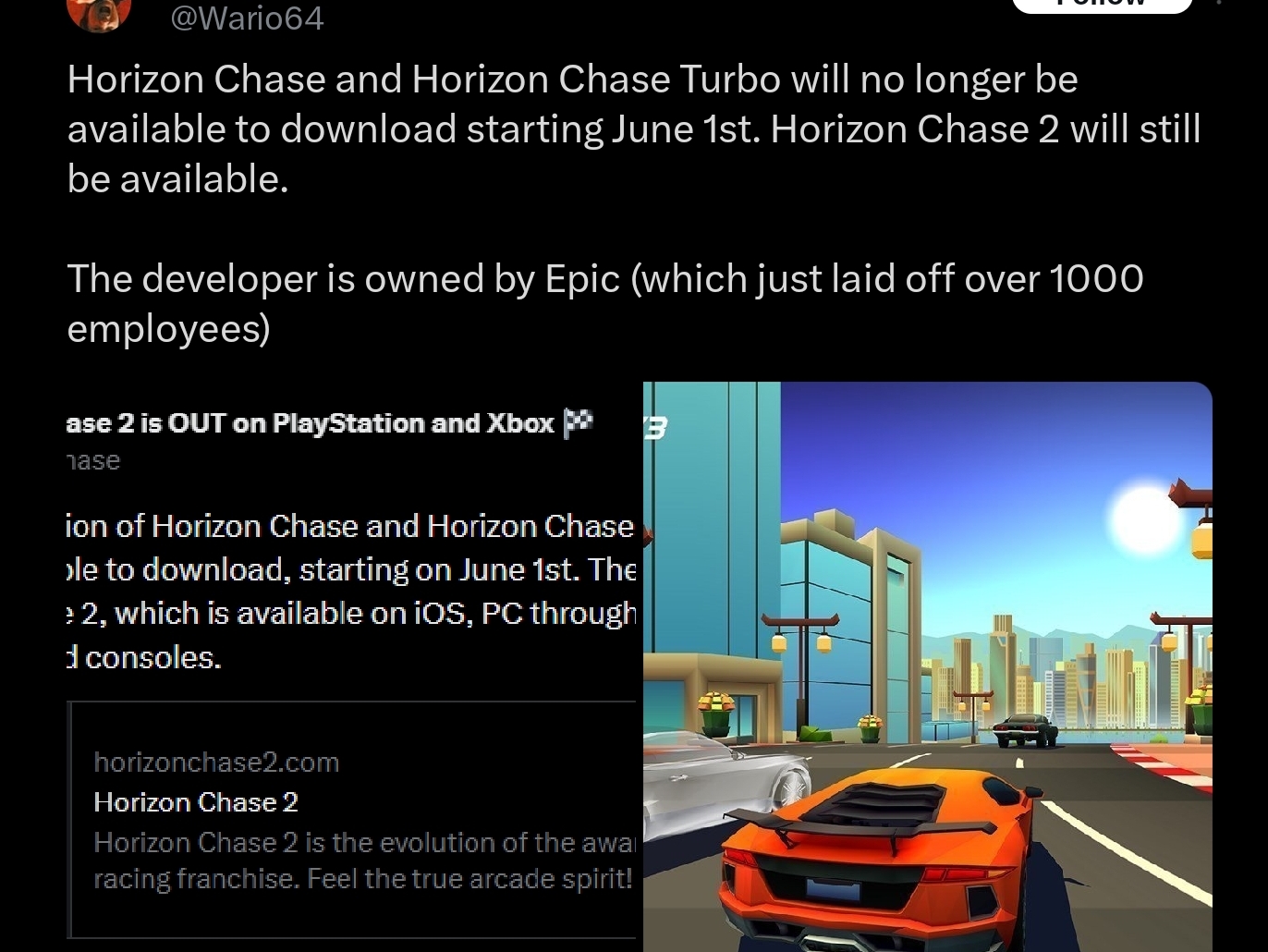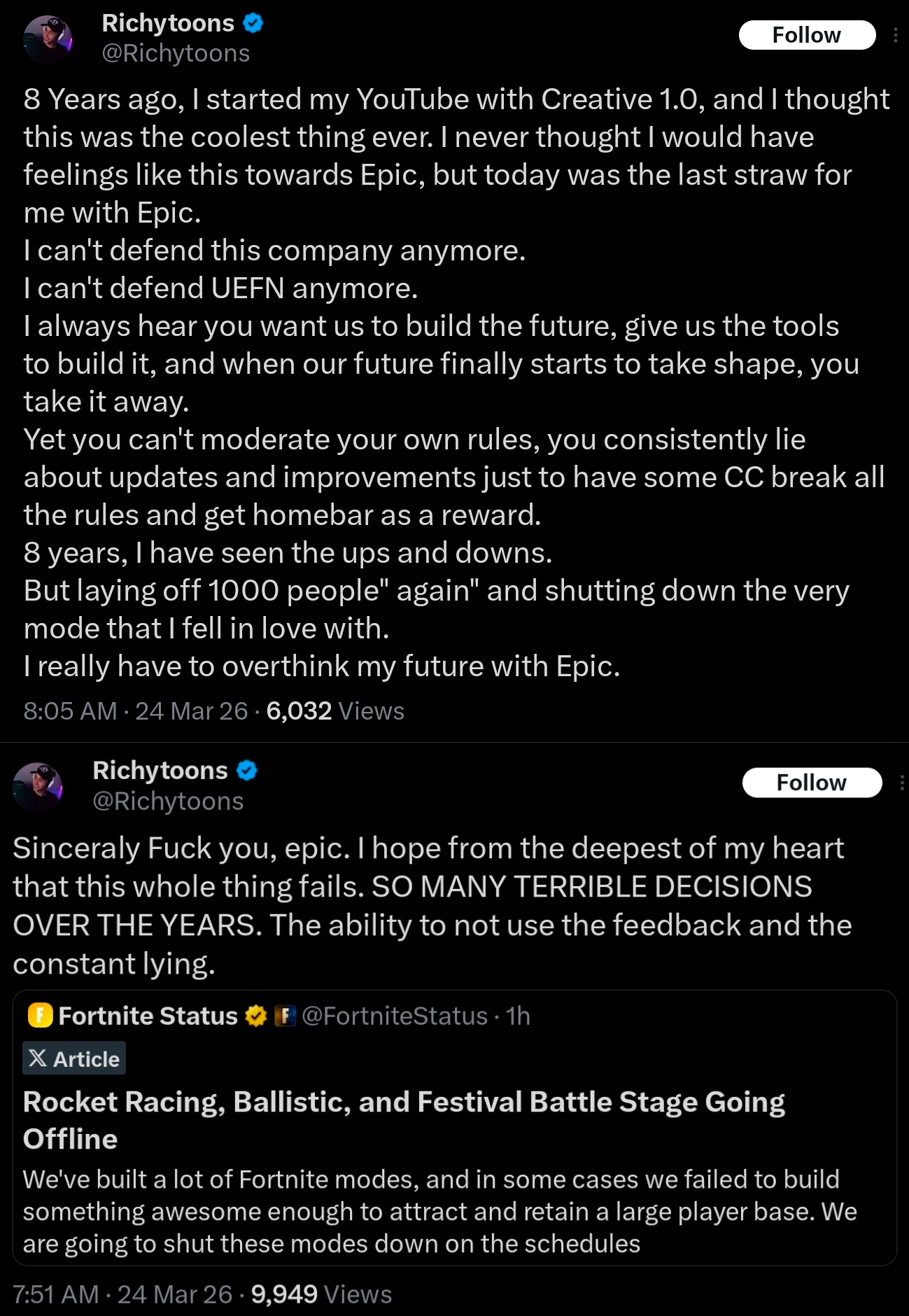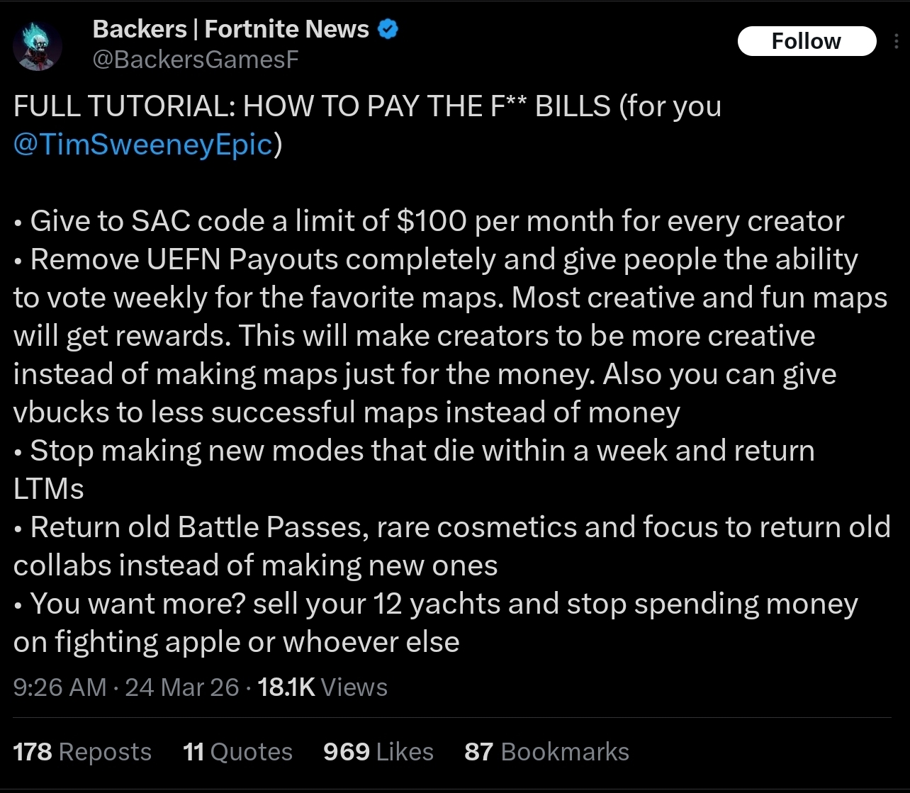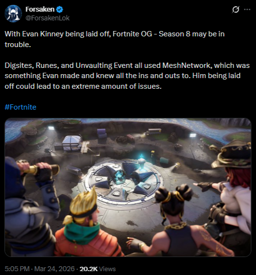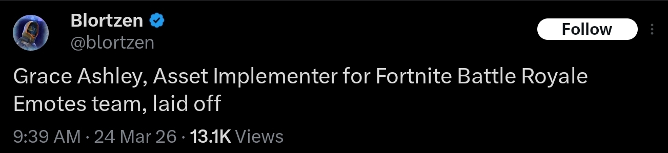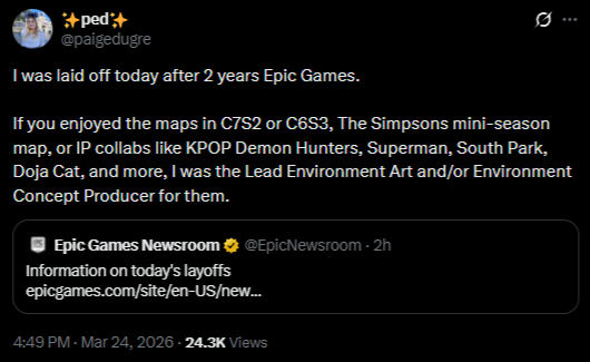 Today we’re laying off over 1000 Epic employees. I'm sorry we're here again. The downturn in Fortnite engagement that started in 2025 means we're spending significantly more than we're making, and we have to make major cuts to keep the company funded. This layoff, together with over $500 million of identified cost savings in contracting, marketing, and closing some open roles puts us in a more stable place. Some of the challenges we're facing are industry-wide challenges: slower growth, weaker spending, and tougher cost economics; current consoles selling less than last generation's; and games competing for time against other increasingly-engaging forms of entertainment. And some of our challenges are unique to Epic. Despite Fortnite remaining one of the most successful games in the world, we’ve had challenges delivering consistent Fortnite magic with every season; we're only in the early stages of returning to mobile and optimizing Fortnite for the world's billions of smartphones; and in being the industry's vanguard we have taken a lot of bullets in a battle which is only in the early days of paying off for ourselves and all developers. Since it's a thing now, I should note that the layoffs aren't related to AI. To the extent it improves productivity, we want to have as many awesome developers developing great content and tech as we can. What we now need to do is clear: build awesome Fortnite experiences with fresh seasonal content, gameplay, story, and live events; accelerate developer tools with greater stability and capability as we evolve from Unreal Engine 5 and UEFN to Unreal Engine 6. And we'll be kicking off the next generation of Epic with huge launch plans towards the end of the year.(1/2)-Tim