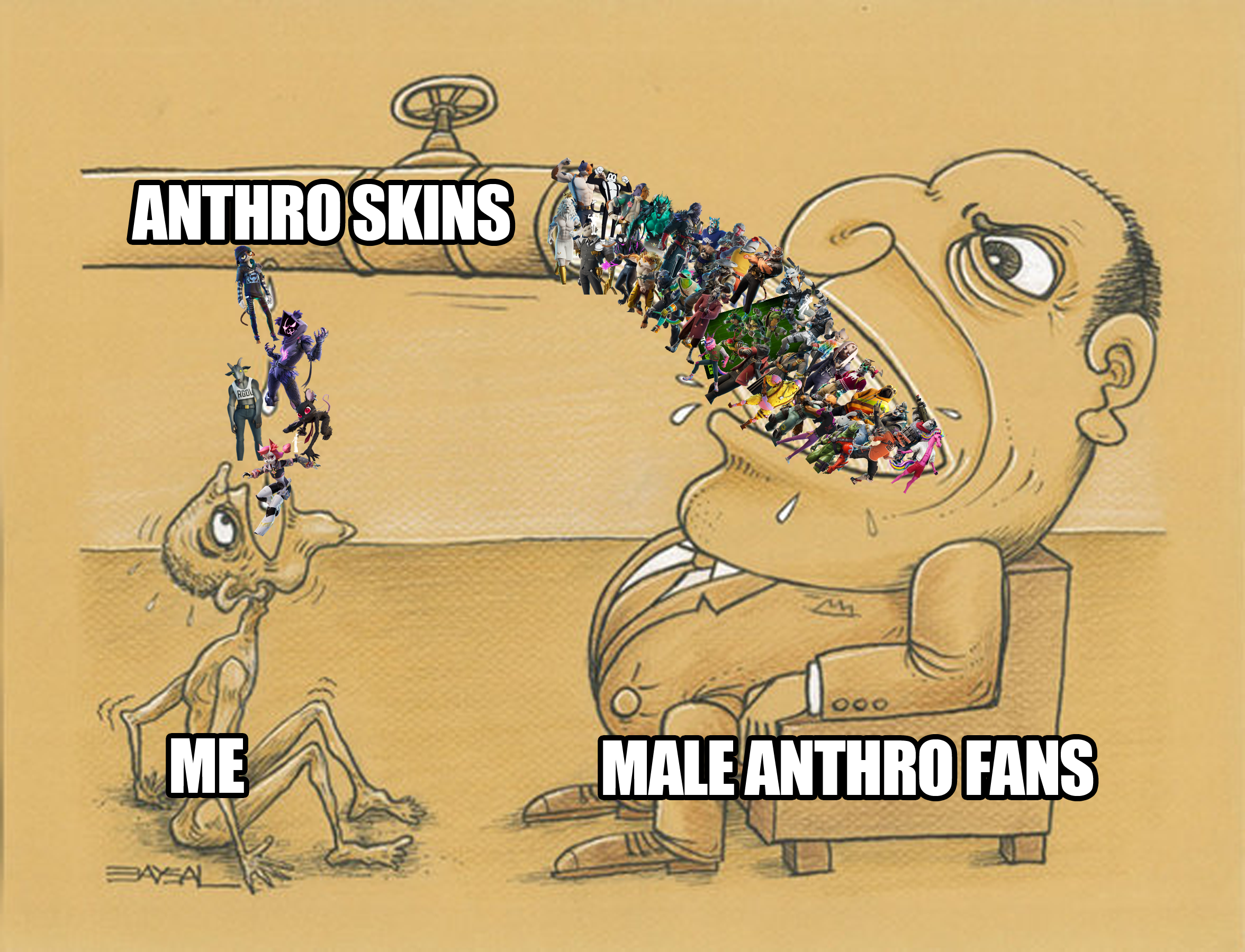 >>561352373the squid?bugs?hybrid in like a week? IDK why people think epic's suddenly going to stop selling anthro skins.