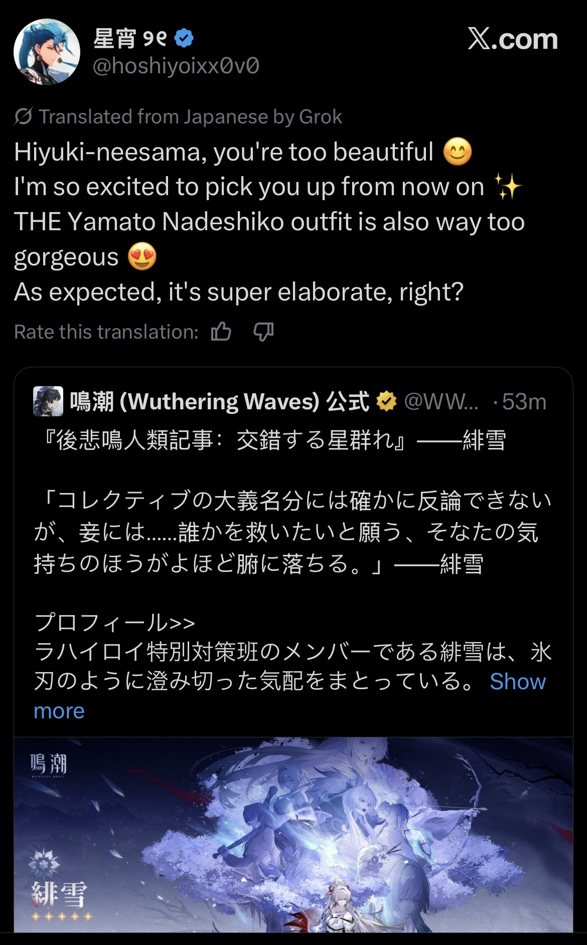 >before 3.0>this game is gooner incelshit for self inserts, genshin better >after 3.0>You don't belong in our game incel, queen slay, yuri so goodWhy do normalfags and troons always try to hijack everything that is good? Once they saw that it was impossible to beat wuwa in quality and gameplay they all moved to wuwa and tried to claim it, hopefully Solon stays firm to his convictions.