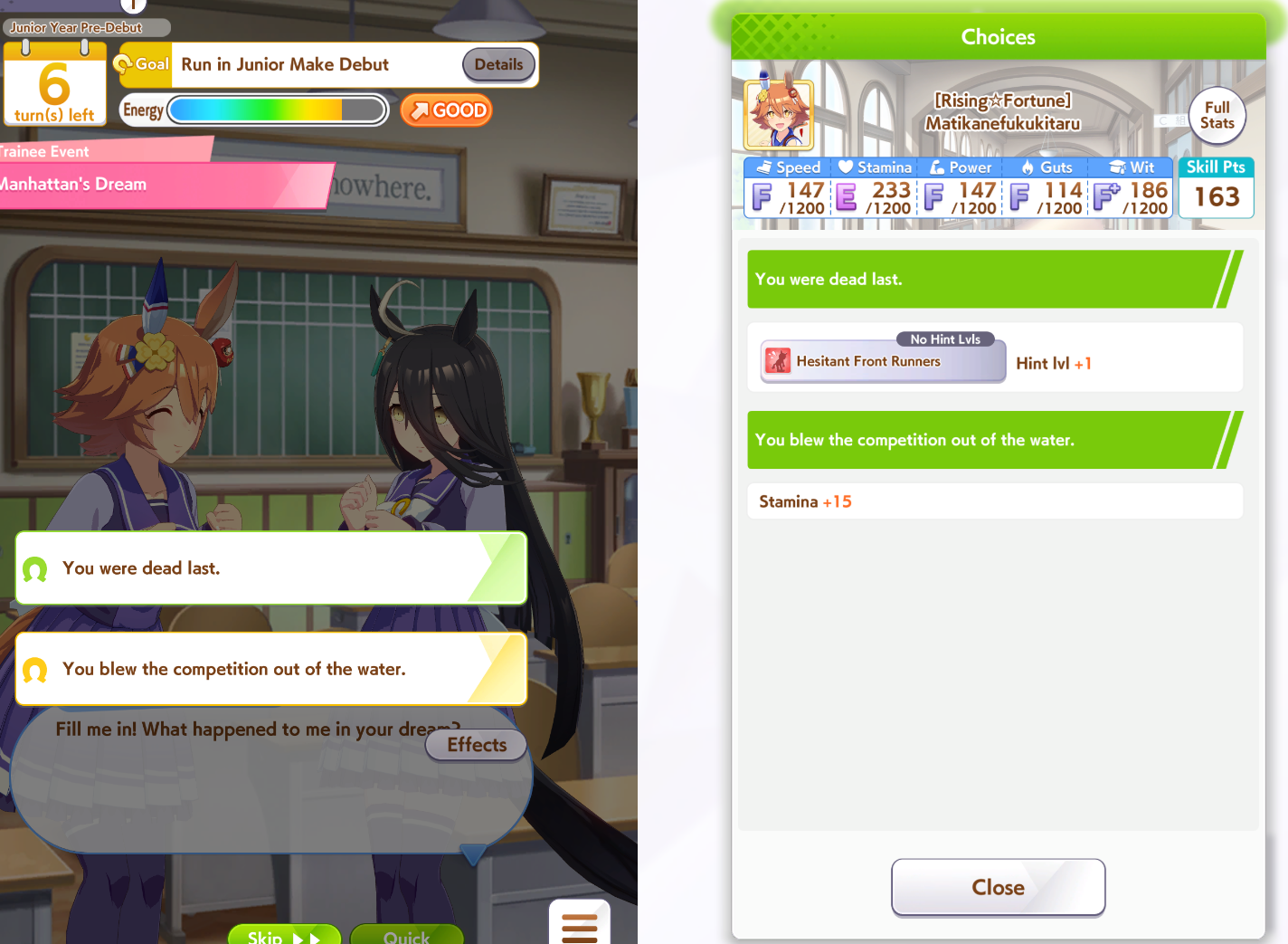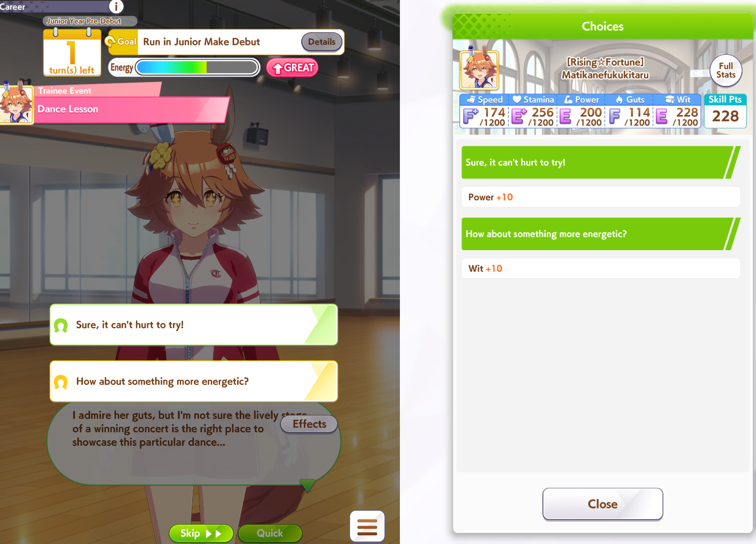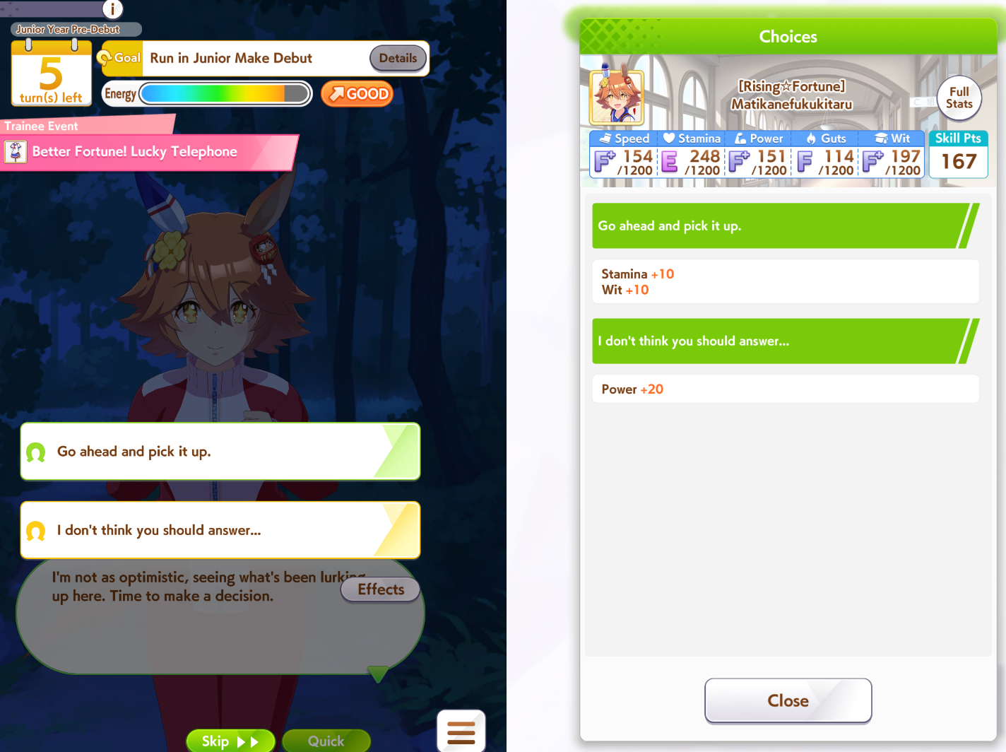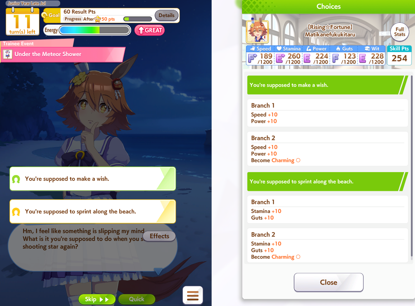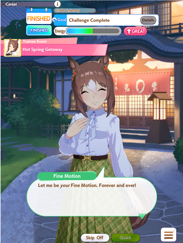 >>561407985Wit trained! Got +30 skill points from event.Now we can do our first mile race. No rival on it though.Also don't forget the shop items!