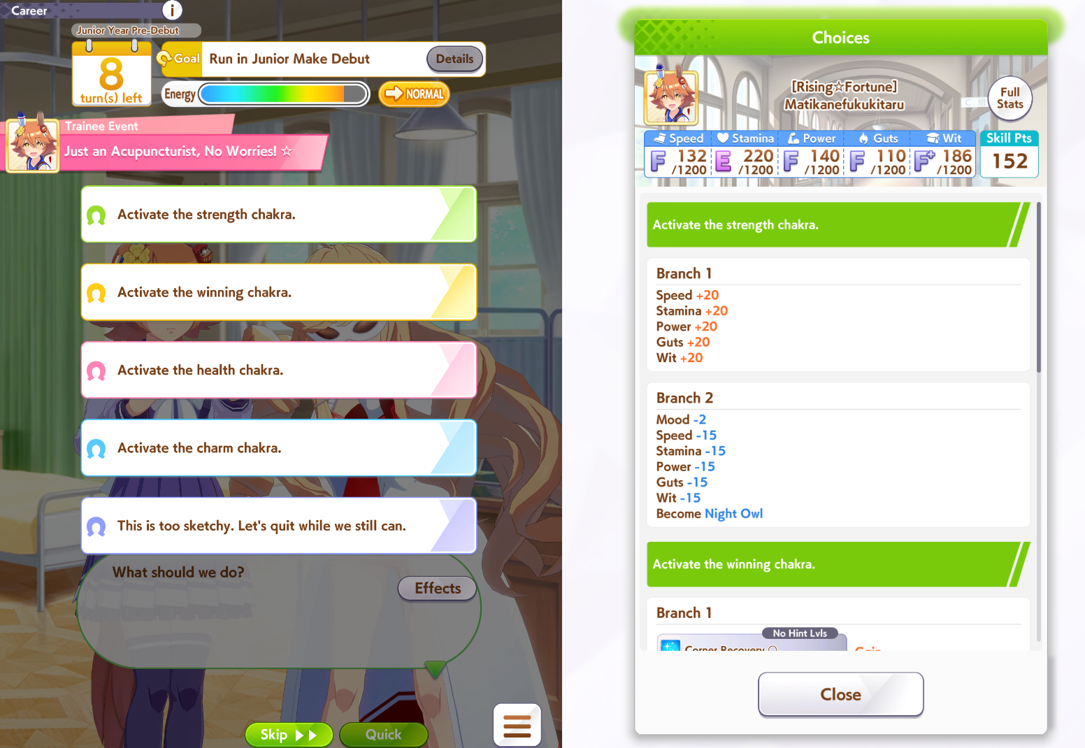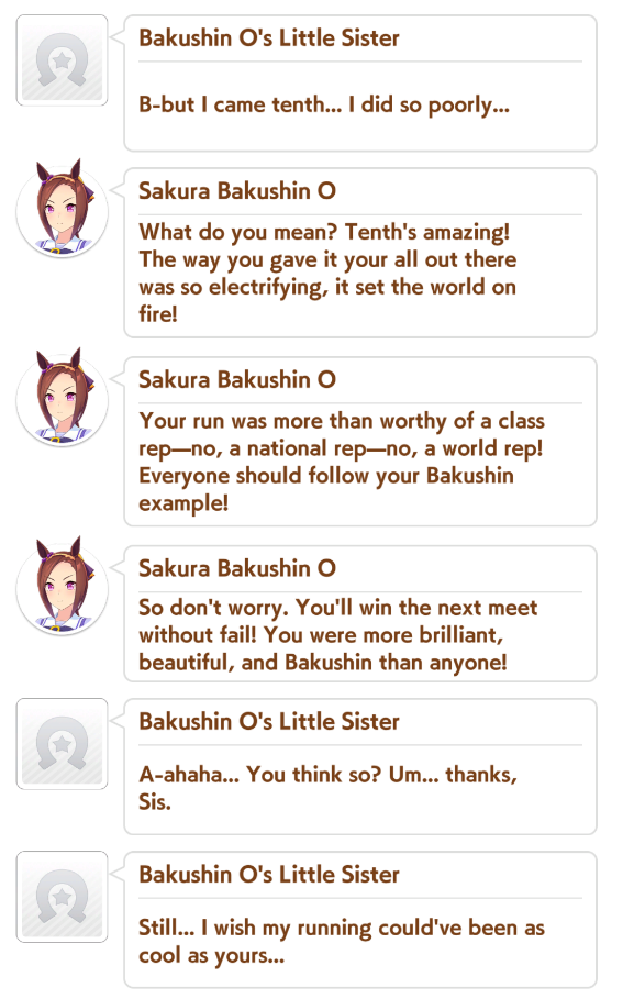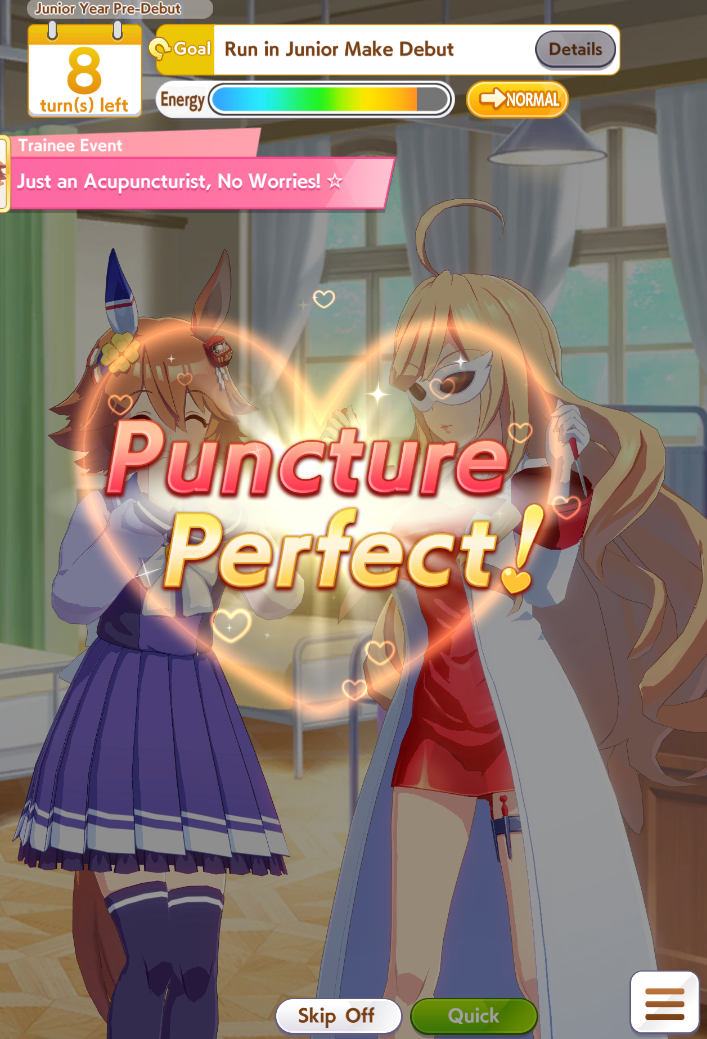 Hey, Anon! Last night some anon complained about not being able to train a good uma. So some anons, me included, offered him help. He disappeared, but I really liked the idea.So, do (You) ever wondered if /uma/ is capable of training a good uma? Are (You) competent enough to be giving good advice to other anons? Are (You) lucky enough to do it without failing trainings or being sleep deprived? Then it's time! (You) are the coach now! Starting next post if there are enough interested anonsI will be posting my uma roster and my deck and you will be selecting anything you want to build /our/ uma. Then, you can guide her to stardom or the glue factory!>why don't you stream it, it's easier and will take less time overallI'm a retard and have no idea how streaming works, I don't have a tw*tch account, and by posting in the thread I think it's comfier.>this will take a long time to finishYes. I have nothing better to do today, and I expect this to take around 3-4 hours. I will have to screenshot almost every training possibility + race results, plus waiting around 2 or 3 minutes for anons' responses to that. I won't take screens of random events and shops though, I'll probably only be reporting that.>will you use the /uma/ uma in next CM?If she's good enough. But I don't even know yet if you will select a long distance uma.>what about learning skillsI'll be opening it for learning skills, or not, on late december of each year.>what about races and clocksI'll preset my regular race agenda, then give you the option to either race or train. Choosing every specific race would be too much work for everyone. I also won't use clocks unless the run goes VERY well.>how the fuck are you supposed to choose /our/ uma or cards without a poalI'll wait for a couple answers itt and choose based on that. If there's a draw, I'll choose it myself. I won't open a poal, it's too much work, there's too many options.Shall we, /uma/?