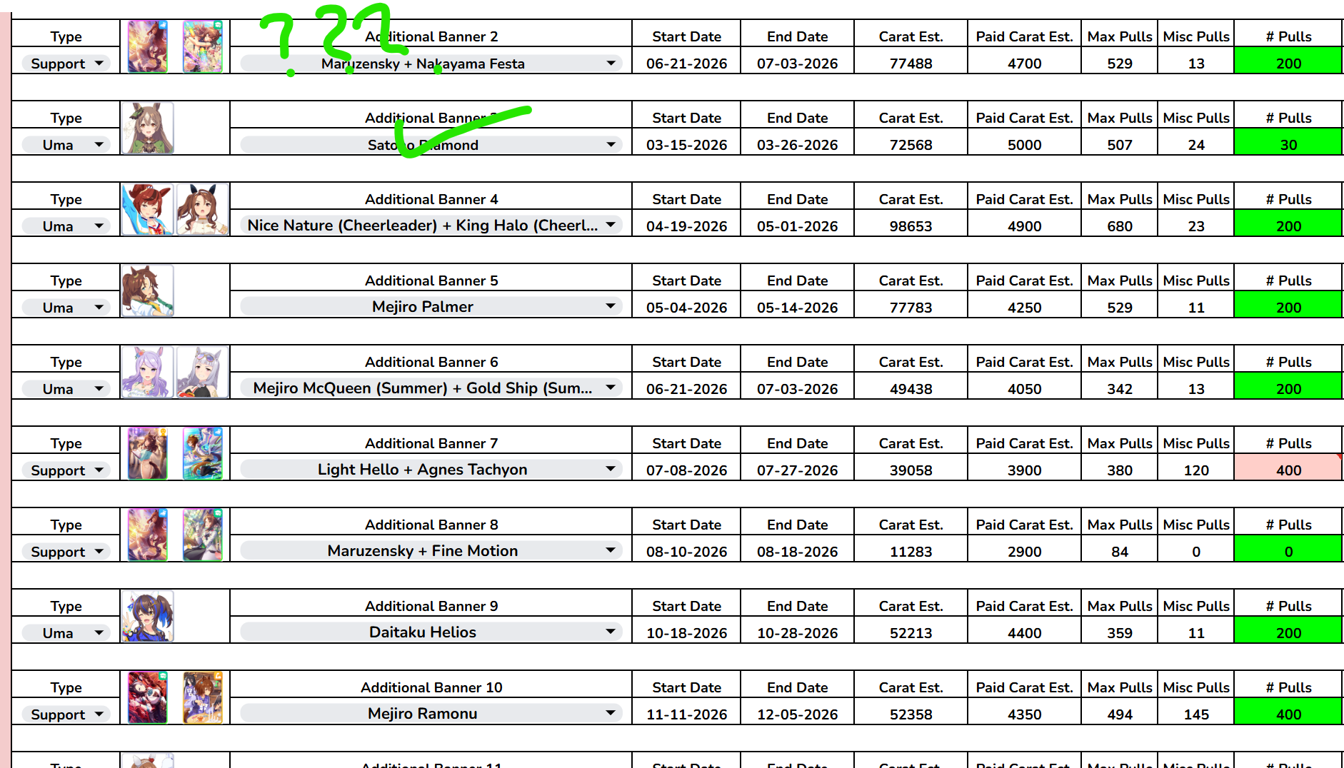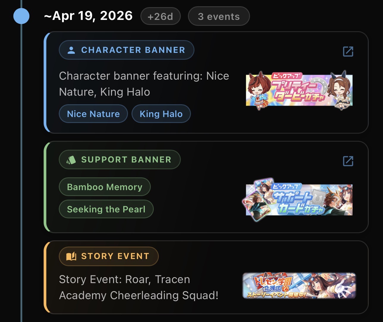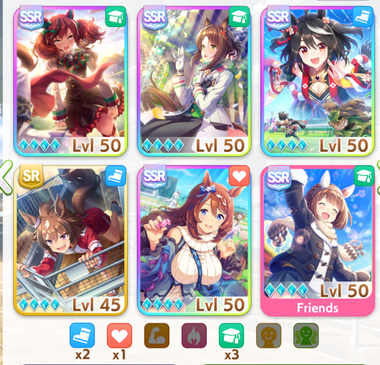Previous: >>561369343>Global Game NewsLink your account to Cygames iDCurrent Scenario: Make A New Track aka "Trackblazer"Current Rate Up Trainee: Satono Diamond (3*)Current Rate Up Support Cards: SSR Marvelous Sunday (Guts), SR Curren Chan (Speed)Current CM: Pisces Cup - Hanshin Turf 3200mhttps://umamusume.com/news/632/03/02 - 04/14 - Halved TP Cost & 2x Career Mode Rewards03/12 - 04/15 - Paid 3* & SSR Selector available in Carats Shop03/12 - 03/24 - Free Daily 10-Scout03/12 - Flying Run-Up! Story Event03/22 - Satono Diamond (3*), Curren Chan (SSR), Marvelous Sunday (SSR)03/23 - First Anniversary Part 303/23 - Agnes Tachyon, Narita Taishin, Narita Brian legends races03/26 - First Anniversary Part 403/26 - Mejiro Bright (3*), Curren Chan (SSR), Zenno Rob Roy (SSR)03/26 - 04/05 - Pisces Cup - Long/Right/Spring/Heavy/3200https://pages.snep.pw/uma/anni-skill-changes/>JP Game NewsCurrent Rate Up: Victoire Pisa (3*), AI-Chan (3*), SSR Yanko, SSR CasinoNew Scenario "Beyond Dreams" releasedTimeline: https://uma.moe/timelineCygames Webstore: https://webstore.cygames.com/en/umamusume_en/>Thread Clubshttps://rentry.co/umaglobalclublistYou must be E3 (20k points) to join a circle. Apply with /uma/ or /vg/ in your profile or post ID in the thread.>All Guides & Resourceshttps://rentry.org/uma26Game databasehttps://gametora.com/umamusume (Click the gear to switch between JP / global server info)A basic guide for newfagshttps://rentry.org/umaglobalFind networks if your region is blocked from the game or clienthttps://www.umavpn.top/Seiyuu & Concertshttps://rentry.org/umstUmamusume Birthday Calendarhttps://ウマ娘.攻略.tools/events/birthdayUma Texthttps://umareader.idsmile.xyz/