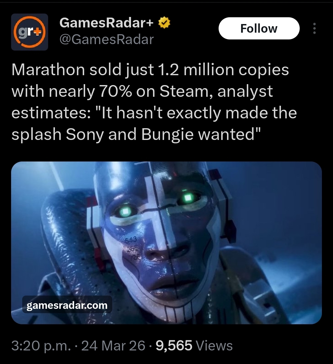 As I said in the prior threadI don't think Sony is going to do anything to Bungie, the bones of Marathon are incredible. More likely they'll just dump money in and eventually Marathon will have its own Fallout 76 or Destiny pivot moment where it turns into a huge success. Doomuncs are getting ahead of themselves...