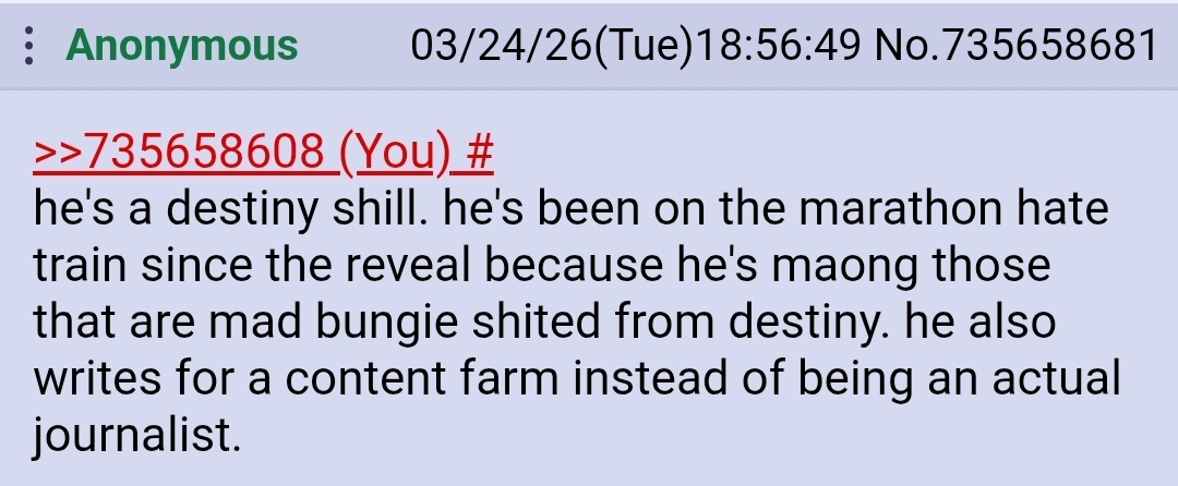 >>561434609Marathon is a straight port of D2 PvP trials, there's nothing extraordinary about it, the game is killing itself in the same way D2 trials did, if nobody talks about your game it's because there's nothing to talk about, you already know all there is to know and Bungie won't make any real additions or changes until next year assuming Sony doesn't axe support beforehand.Besides, it's mostly the /v/ concord fags who flood your thread these days, if not your very own players with buyers remorse trying to cope.>>561435024YOU shat up our general first with the constant shilling and astroturfing, if you got undesirables from here carrying over and disrupting your safe space with schadenfreude it's solely your fault.