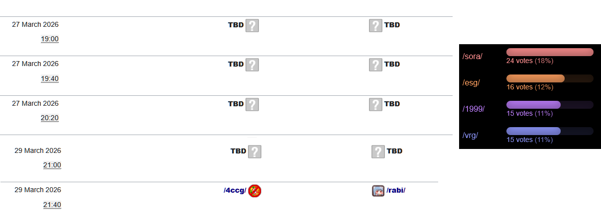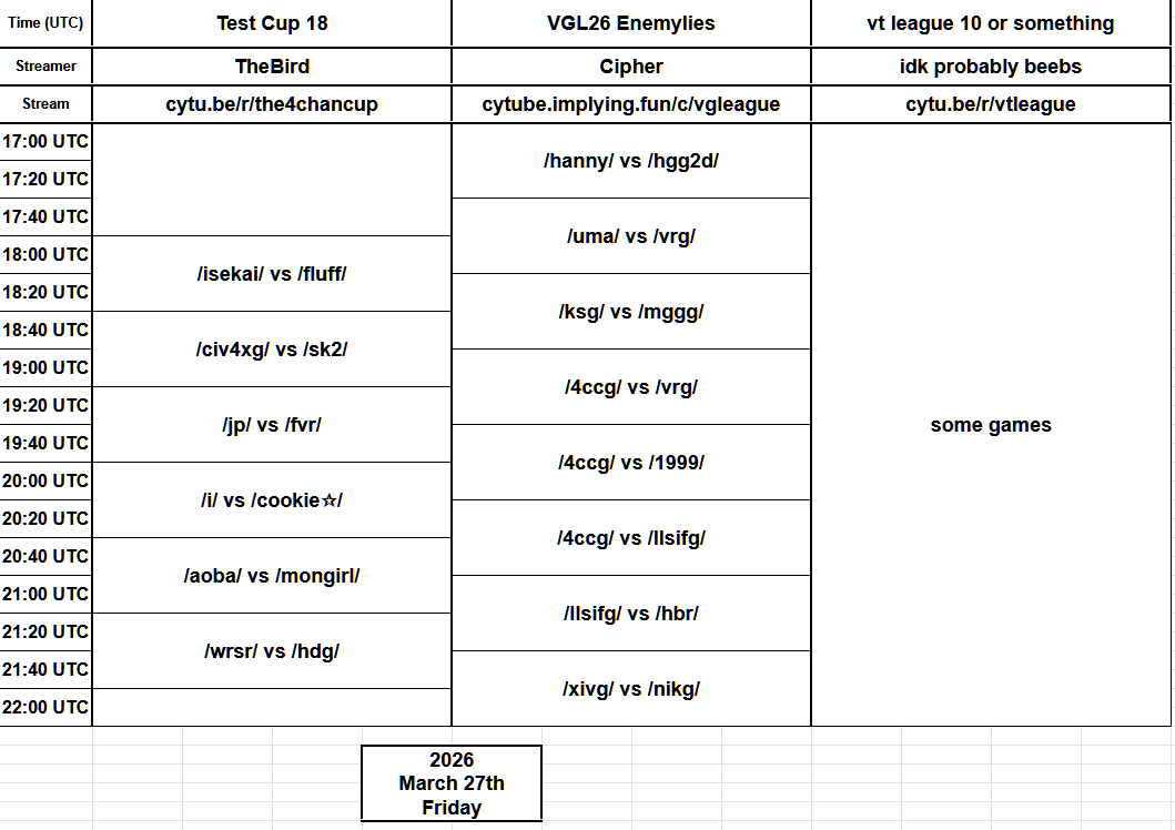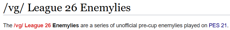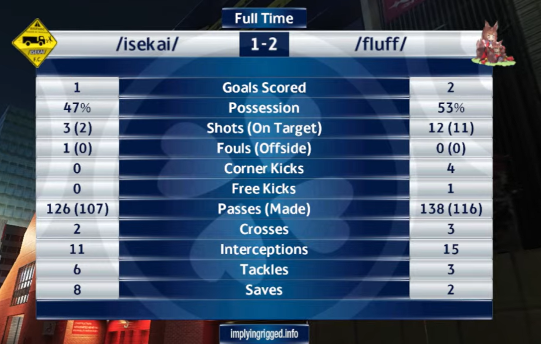 Previous: >>561193360>What... is this?Put simply, a simulation of Pro Evolution Soccer being competed between teams which are embodiments of boards of the 4chan imageboard. The players represent facets of each board's culture. All of the matches are AI versus AI. However, humans "manage" each team, creating their tactics and giving input during games as they happen to make substitutions and tactical changes as they see fit.https://implyingrigged.info/wiki/FAQ>Where can I watch the cup?https://isthisliv.com/4cc/stream.html>Upcoming Cupshttps://implyingrigged.info/wiki/2026_4chan_Spring_Babby_Cuphttps://implyingrigged.info/wiki/2026_4chan_Summer_Cup>Upcoming Invitationalshttps://implyingrigged.info/wiki//vg/_League_26_Enemylieshttps://implyingrigged.info/wiki/Test_Cup_V_18.1https://implyingrigged.info/wiki/2026_4CC_Champions_Leaguehttps://implyingrigged.info/wiki//ag/_League_9/11:_Never_Forgethttps://implyingrigged.info/wiki/Very_Genuine_and_Legit_Vidya_Game_Leaguehttps://implyingrigged.info/wiki/Beta_Bowl_4>Wiki:https://implyingrigged.info/wiki/Main_Page>Sekkrit Code37pebis>DLC Passworddivegrass>Booruhttps://isthisliv.com/booru/>Archivehttps://implying.fun/>Other videoshttps://implyingrigged.info/wiki/Videos>PES Infohttps://implyingrigged.info/wiki/Pro_Evolution_Soccer_2015https://implyingrigged.info/wiki/Pro_Evolution_Soccer_2021>Previouslylogosenemyliesfatposting