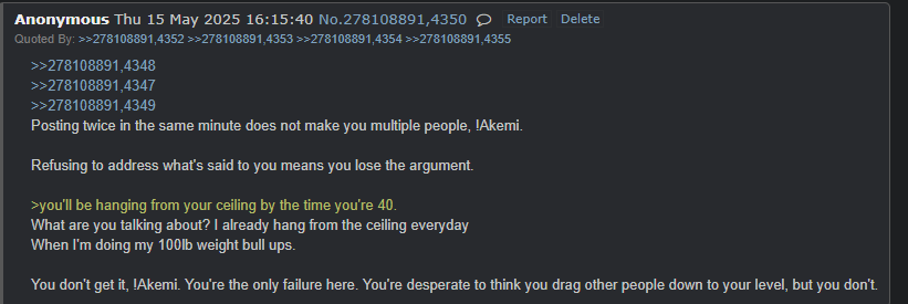 >!Akemi screams and begs people to think he's more than one person>has extremely obsessive and consistent behavior patterns that haven't changed at all in 15 years>>561495852>>561495878>>561496007>>561496364>>561494786>attackingSo you're admitting you're trying to attack people, and thus everything people say about you is correct and you are wrong for acting the way you do.It's funny how you're so fucking mentally ill that you tunnel vision on trying to force people to accept you're more than one person, but don't try to defend the mental illness that you're obsessed with trying to attack people.