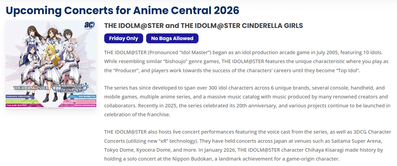 >>561482561>The live concert will take place on Friday, May 15th (Further Details TBA) and will be free to attend with a valid Anime Central 2026 badge.>A live and talk show event will take place on Friday, May 15th with a cast of three 765PRO ALLSTARS members and three CINDERELLA GIRLS members.