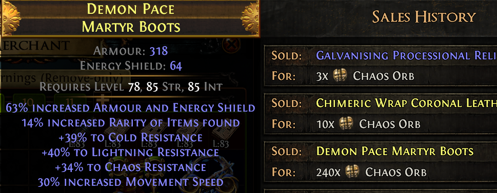 >>561496832>but I can't see a way to get more easilythe baseline should be starting with amethyst rings over other ring types if possible, because the implicit chaos res is already sizeable. they tend to be available from vendors in the campaign, and I like to fit my other gear around ensuring I have 2 of those no matter how shitty they are in terms of their prefixes/suffixes.>Am I missing anything obvious?use the passive tree early to relieve some ele resist pressure with nodes that are close, so that you can use suboptimal gear that happens to have chaos res. you don't need to cap chaos but keep it at around 50% at least imo.Breach tree, gold gamble, shipping for armour, betrayal drops (I like these a lot but watch out for Tora and Korrel and any member with bullshit petrification statues kek) can make it more likely that you get gear with chaos before you have enough essences/lifeforce/alts to put it together in other ways.The exalt/regal droprate buff should be leveraged, it's much more reasonable to alt and regal, or reforge and exalt gear now.