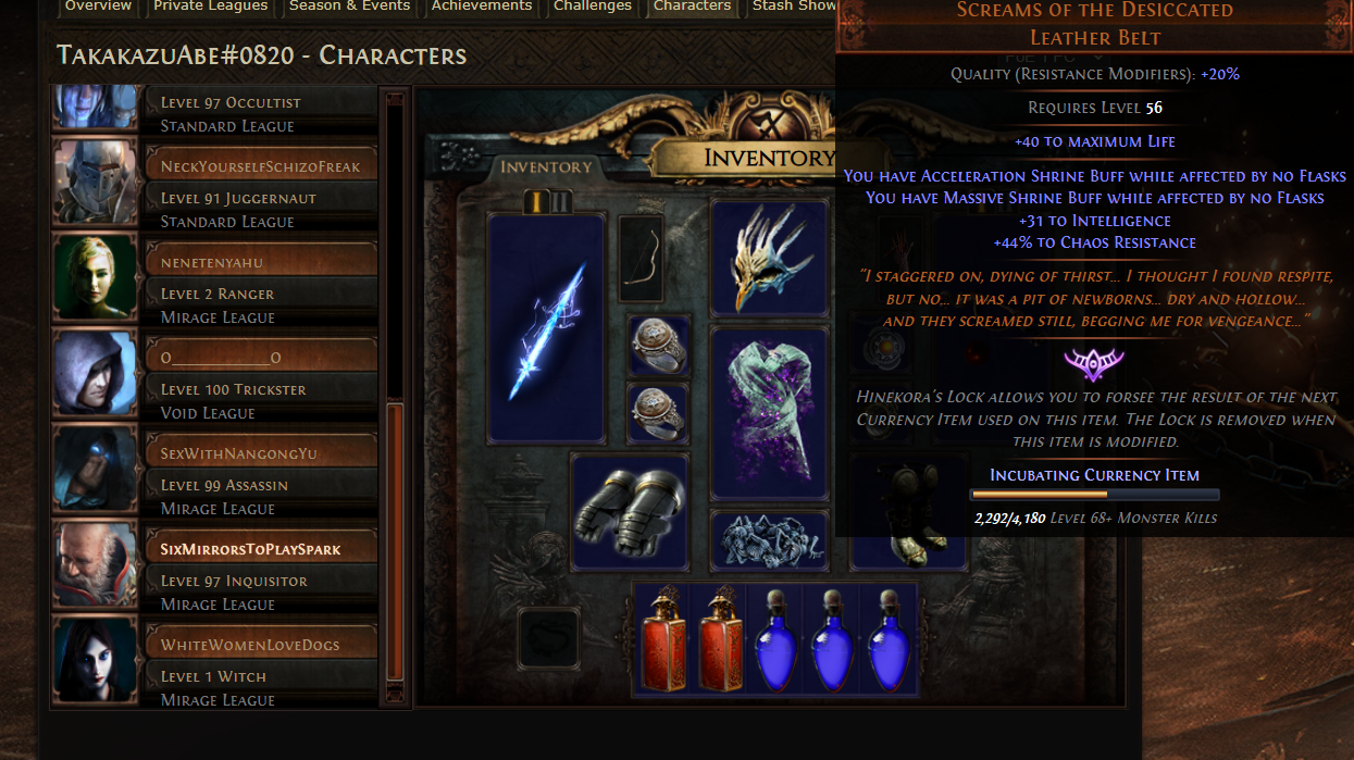 >>561544559>>561544465>>561544359This is the looking like the story, the original bugged 25000% fire resistance chest had missing original copies since late Sentinel league and they only resurfaced late in the Keepers league patch. Somehow, Jenebu managed to track down the original owner and take control of them. Imagine how much he paid.