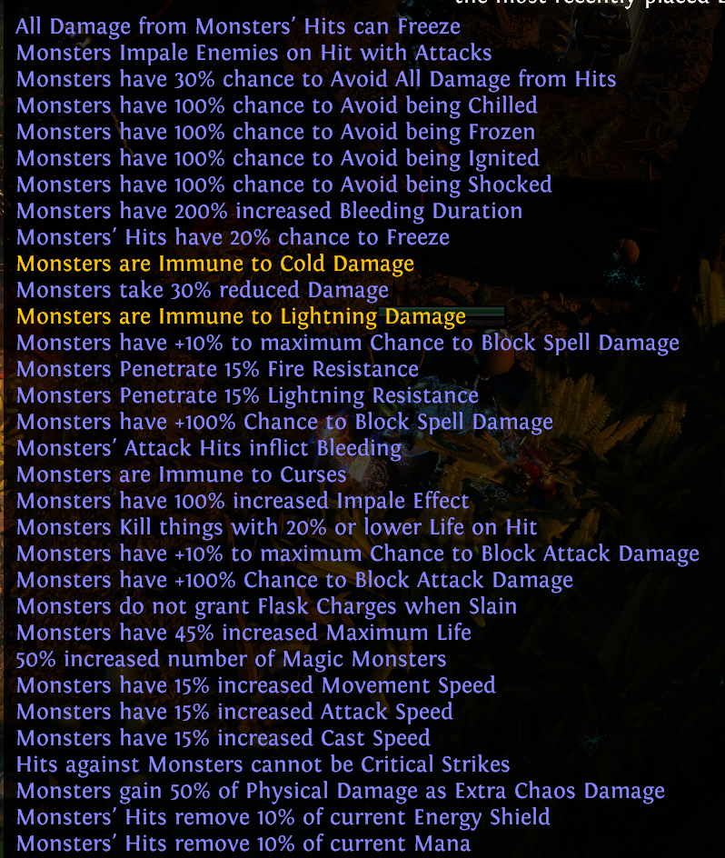 >>561498053Reflect is easier to solve now that it got reworked, you have various sources of less reflect damage on pantheon, chest implicit, flask, protection mastery and maybe a few more places.Consider figuring reflect immunity out cuz you can just run 2 more map mods for free. You might have a bit of an issue if you're running some bowfag unique chest setup, but it's probably not even impossible with that, just look up all available sources.