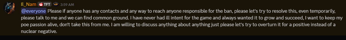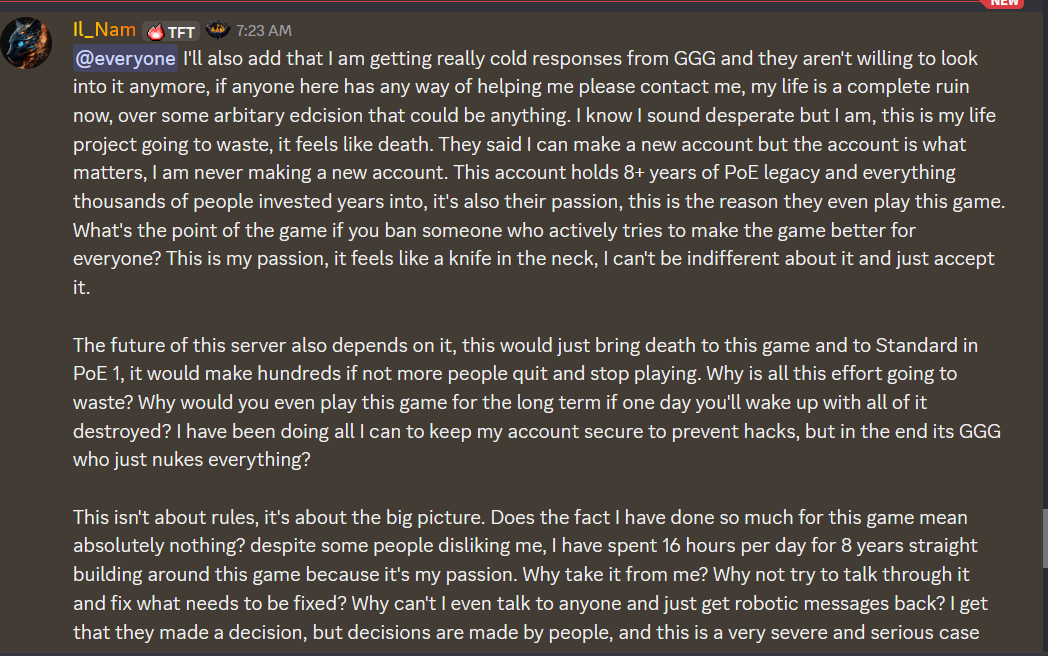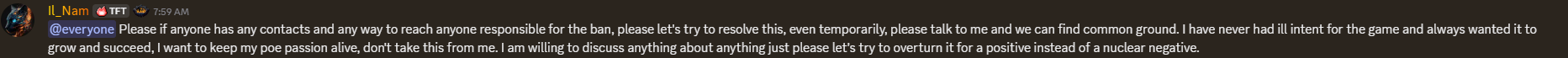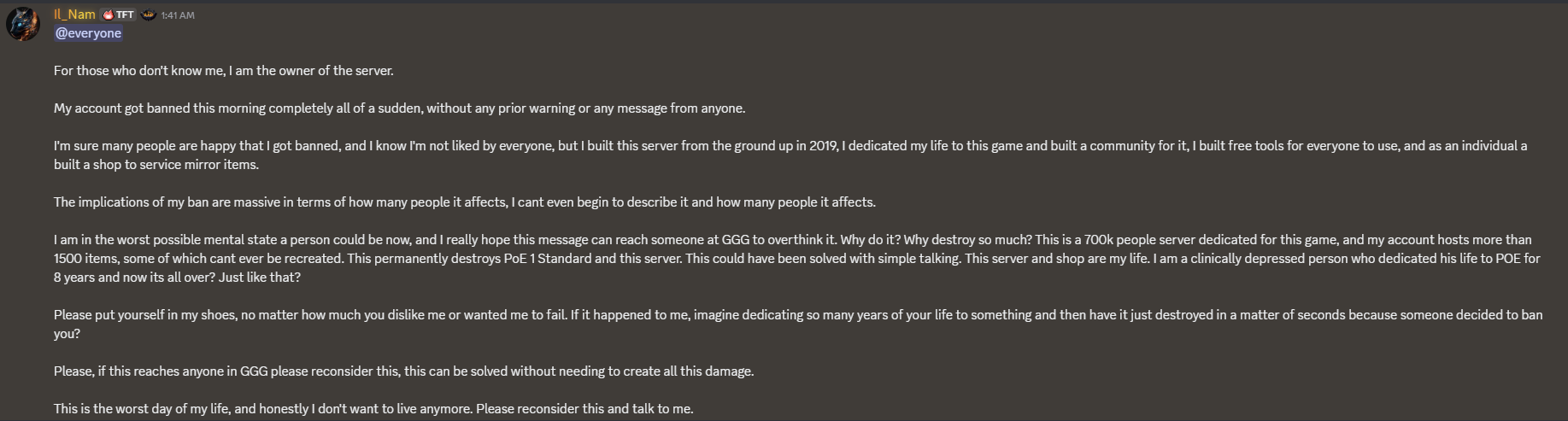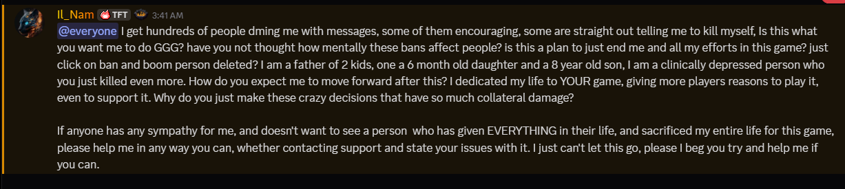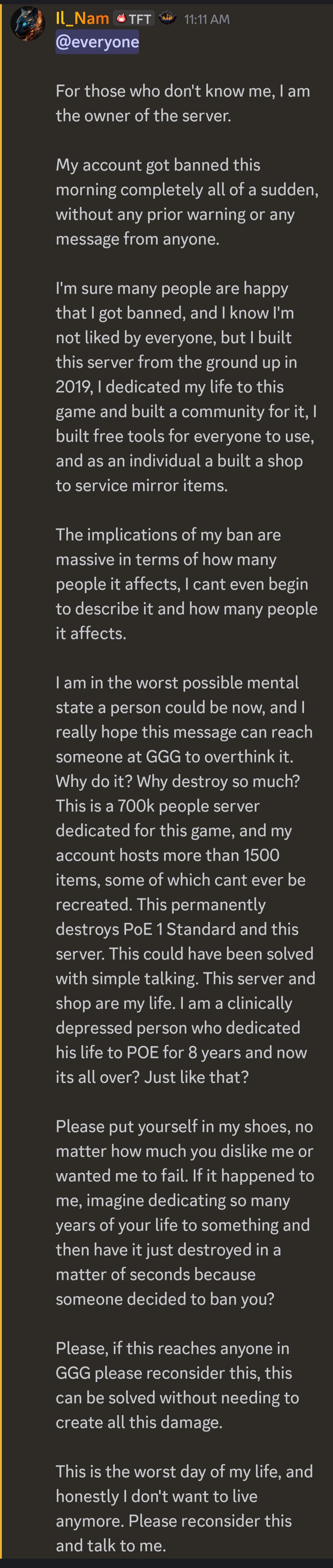 >>561543981this guy is an unhinged psychohe is claiming depression and sadness but at the same time sending people to doxx GGG employees who are "responsible for his ban"he is also nuking his 700k server as some sort of powerplay to show GGG he can strike back?weird