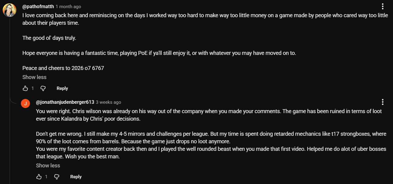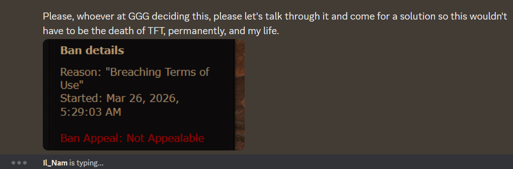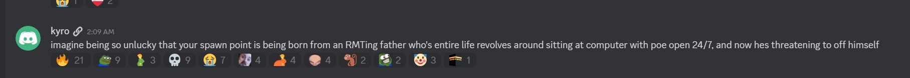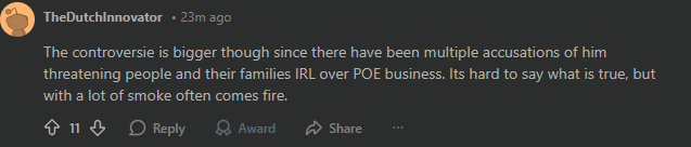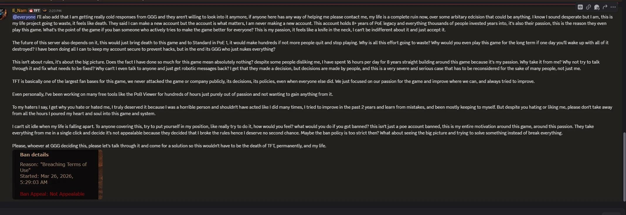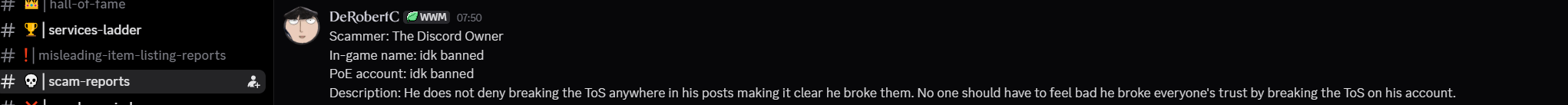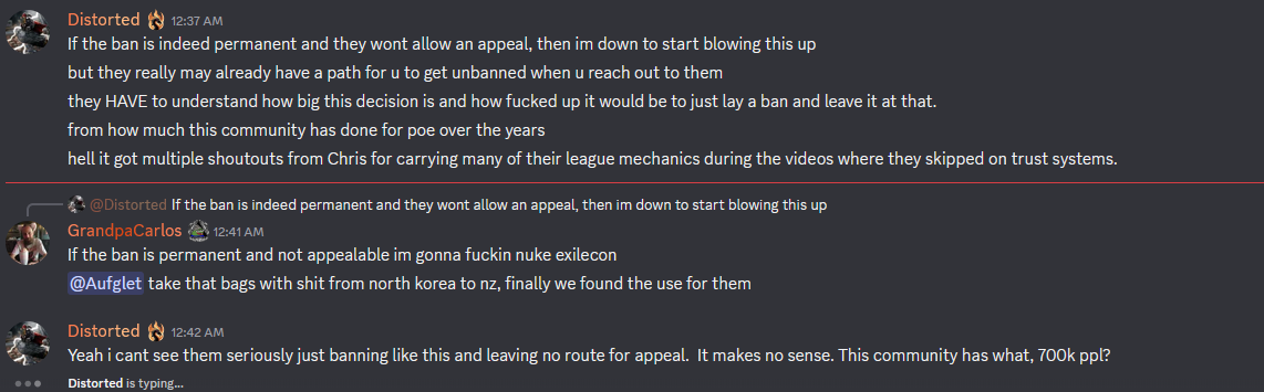 >>561543981this guy is an unhinged psychohe is claiming depression and sadness but at the same time sending people to doxx GGG employees who are "responsible for his ban"he is also nuking his 700k server as some sort of powerplay to show GGG he can strike back?weird