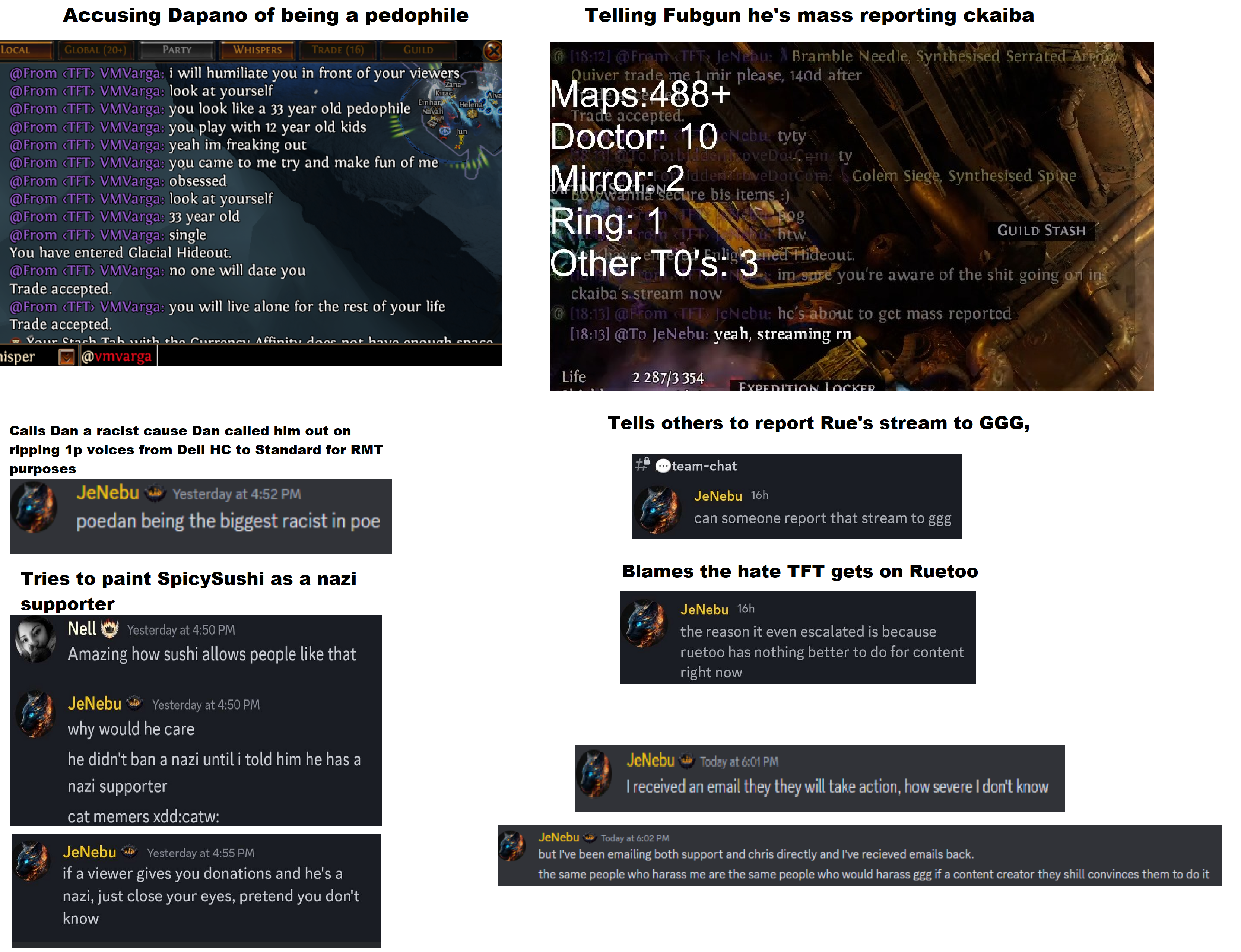The ban is not for RMT.It's something even more retarded than thatso you may have heard of the bugged fir res chest on standard. Jenebu got access to the ORIGINAL copies and recrafted them slightly. Thats the important part. He was knowingly interacting and distributing an original copy of a bugged itembug abuse = banNormally, previously, people would have to trade the old mirrored copies of the bugged fire res chest =/= does not implicitly indicate bug abuse. Knowingly recrafting, doing mirror fees and mirror sales of the bugged item = huge no no.
