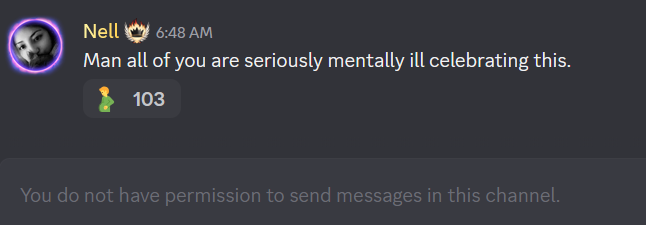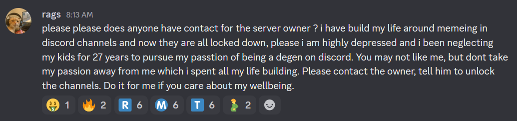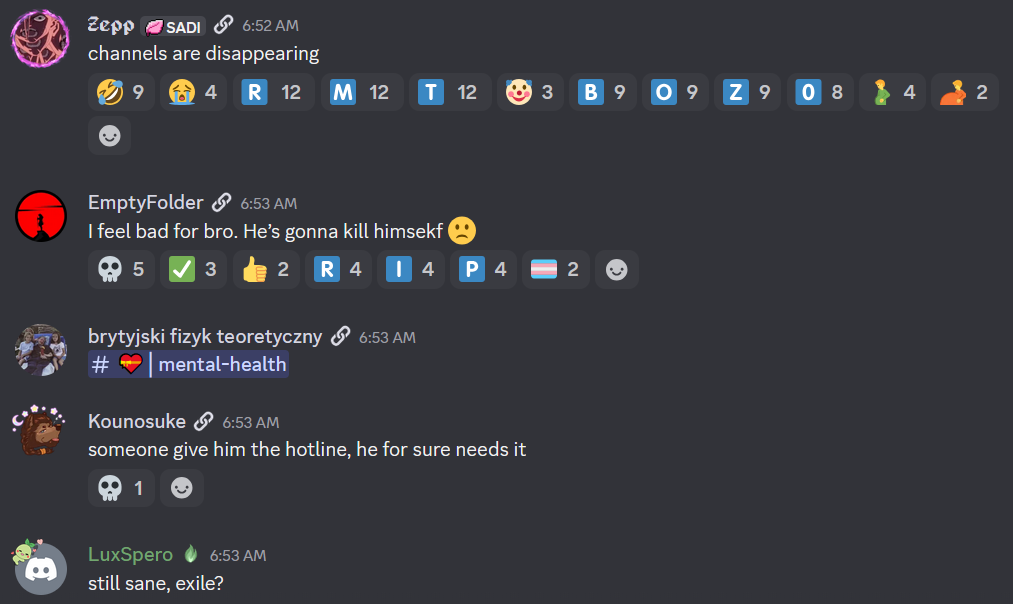>>561545573>>561545590the general server is closed and the reactions were deletedbasically all messages that added "R M T" reaction to a message were nuked