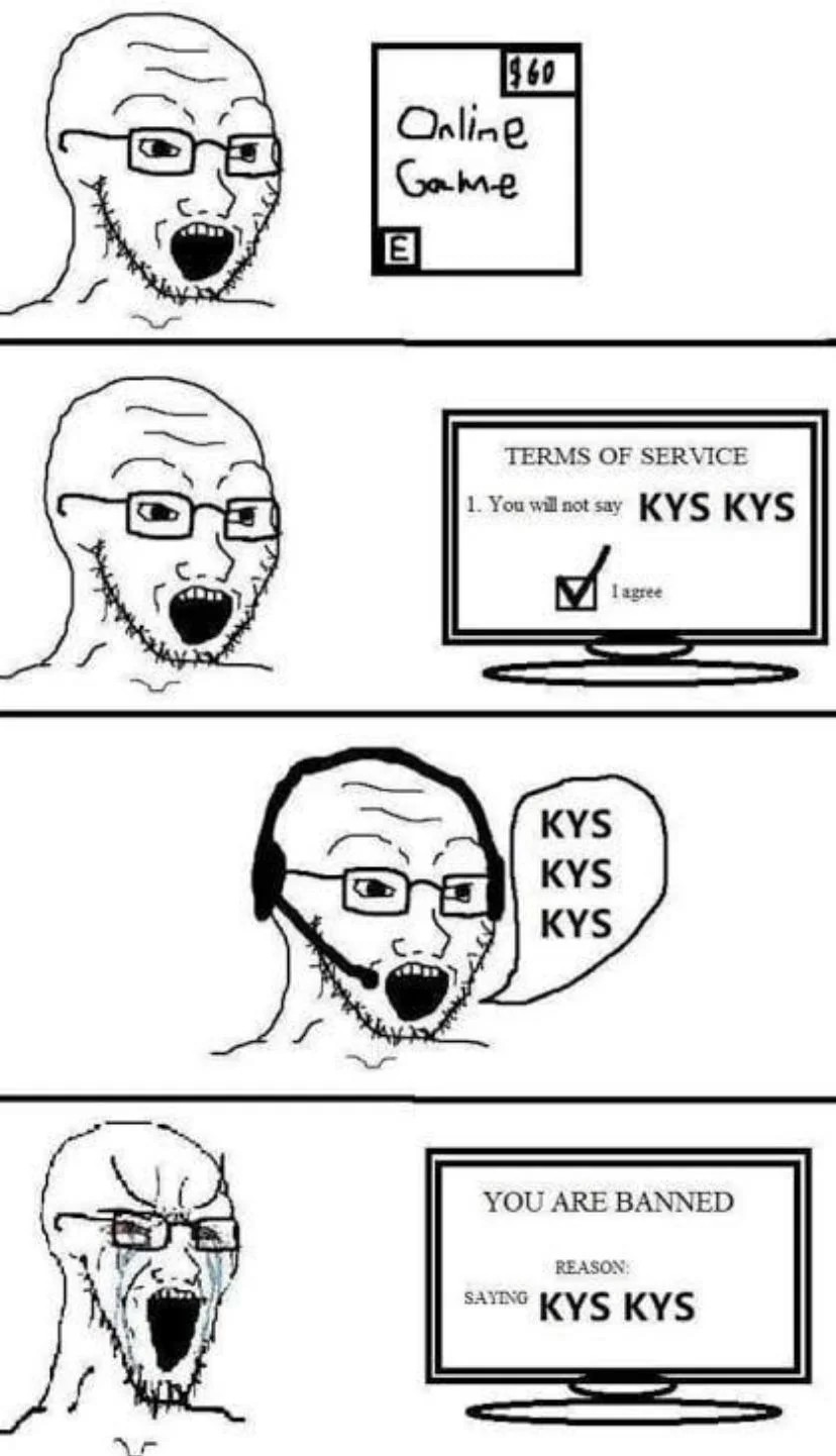 You have this board to act like a massive piece of shit and get your demons out. If you're such a massive piece of insane shit that you can't even keep yourself from getting banned by being mask off all the time in ingame chat to the point where they make it permanent you have only yourself to blame. The companies are already financially incentivized to keep you as a player who keeps buying MTX. You gotta really do something absolutely stupid to get yourself banned.
