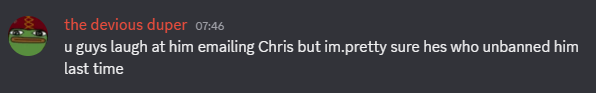 >>561544596Because Chris, the d2jsp power user unbanned him.He's gone now.