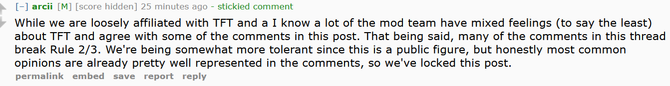 >>561544596He's treated people like shit for years and powertripped out multiple times. It's been constant drama. I can't believe anyone would ever be cucked enough to even use TFT in the first place.