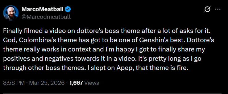 >>561508803>>561508830Interesting. Recently I've been thinking about language in genshin. In OST since the new composer came in he likes to introduce lyrics into the OST, which is fine. Yu peng chen rarely used vocals and that was to show how lonely a place was, think enkanomiya and stormterrors lair. Back to the topic at hand, we now have lyrics in french for furinas song meaning fontaine's language is french, german for mondo, swahili for natlan, and maybe russian for snezhnaya. However where it gets interesting is columbinas lullaby is in latin meaning that's the language the moons spoke also koitars song is in ancient greek meaning that's the language the HP and shades speak.Also how does everyone understand each other, what is the lingua franca of teyvat? Maybe fontainian? Or liuyese because china numba one