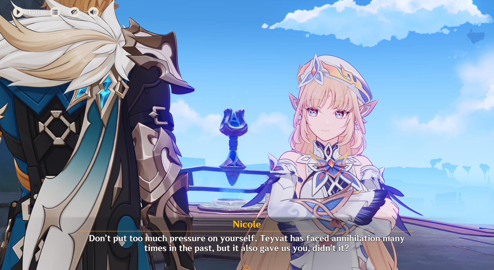 >>561507873>Has anything relating to the woman at the very start of the game that separated Aether and Lumine been revealed yet?Not much yet, but it's close. She was implied to be watching from the background of a single frame of the main quest from last year, there are some clues that she's missing. She's one of 4 shades, aka gods, and there was a short animation starring the other 3 last year.https://www.youtube.com/watch?v=jvXVmvW8ZQwIt's been leaked we're finally visiting her domain next update, so that should give some info. It's nearing the end of the journey around the 7 nations of teyvat, so within the next year or two the plot should progress a lot.