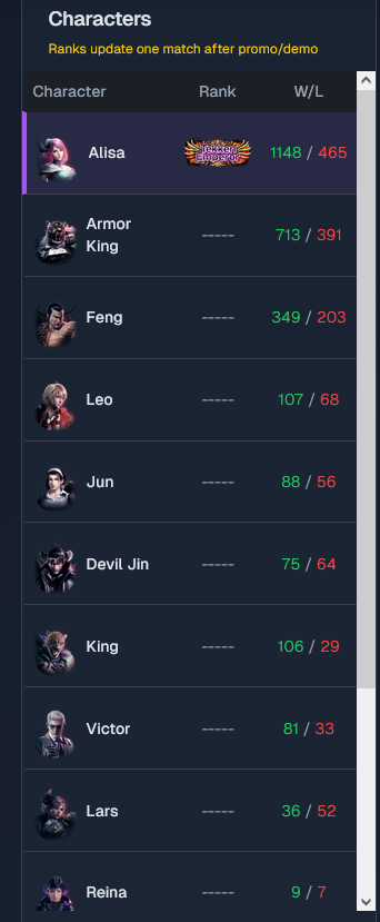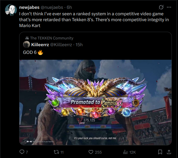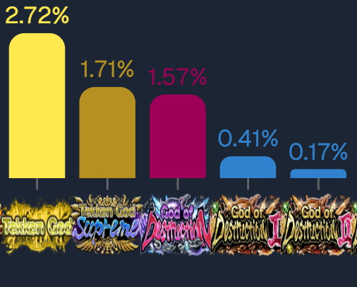>>561705687I should aim even higher then, GOD1 or 2. Obviously won't happen, but based on picrel I'd say the huge dropout from TGS/GOD to GOD1 and 2 has to correlate to a noticeable skill gap, even in Tekken 8, right? Like, GOD1/2 players can't be just mashing monkeys.By the end of the season people will move up regardless of skill, so the goal has to move as well like you said, as the average player will likely get GOD/GOD1 without much issue.