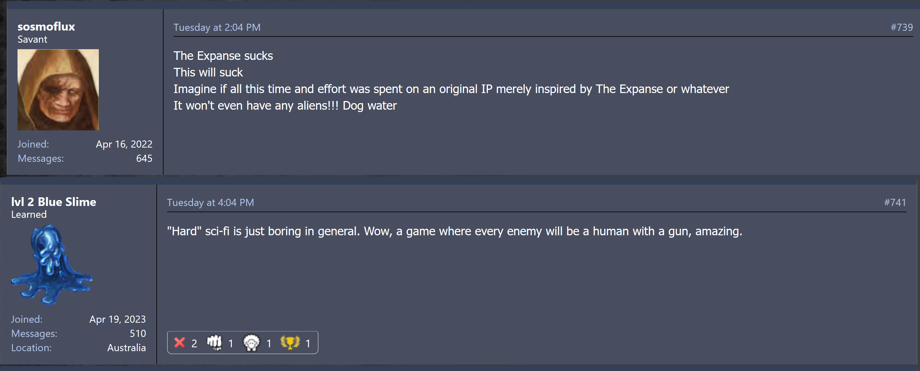 >>561523030>Hard(ish) political scifi with emphasis on grounded character relationships. >Super high concept sci-fi with massive a massive timeline, aliens galore and relativistic time dilation shit between chapters.They're doing pretty different things. It's easier to see how the expanse will work though. Realistic shooter with light RPG character building and Owlcat style companions seems fairly bulletproof. But, I have no idea if Exodus can pull off it's pitch.