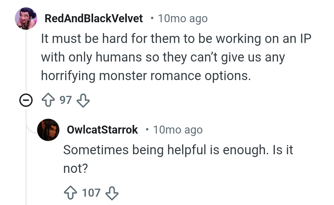 >>561517573It would make more sense if it were of the opposite sex and romanceable.