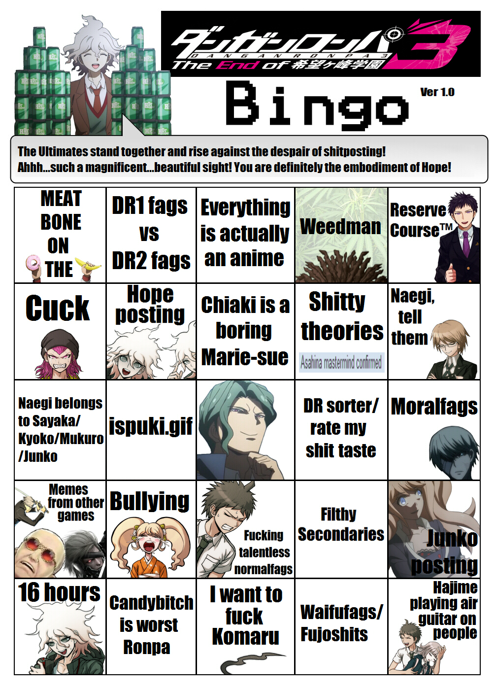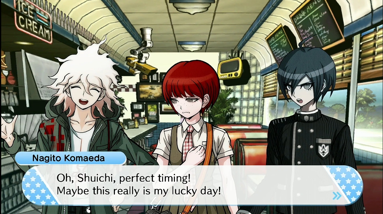 Oldfag here from the pre-V3 era. Revisiting the franchise with a new player and now starting up the DR3 anime. I'm looking forward to 2x2. I struggle to look fondly on V3 at all because of how disconnected it was and how much it just dunked on fans instead of being played straight as opposed to playing the meta narrative. I've been doing the DR S stuff for a bit as well and the V3 cast just does not belong there at all. Would have been better to not even have them or to treat it like a bunch of transfer students or something. They shouldn't be hanging with original game casts. >>561526145>>561535663Danganronpa Another Episode features a ghost that lore dumps information about the main antagonist to Komaru. Ghosts have been canon long enough to matter.