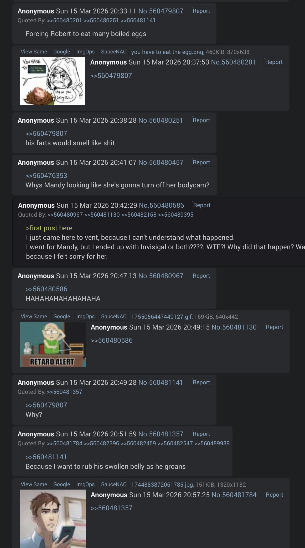 >>561577454>Violently shits himself in your path to protect and preserve Robert's virginity