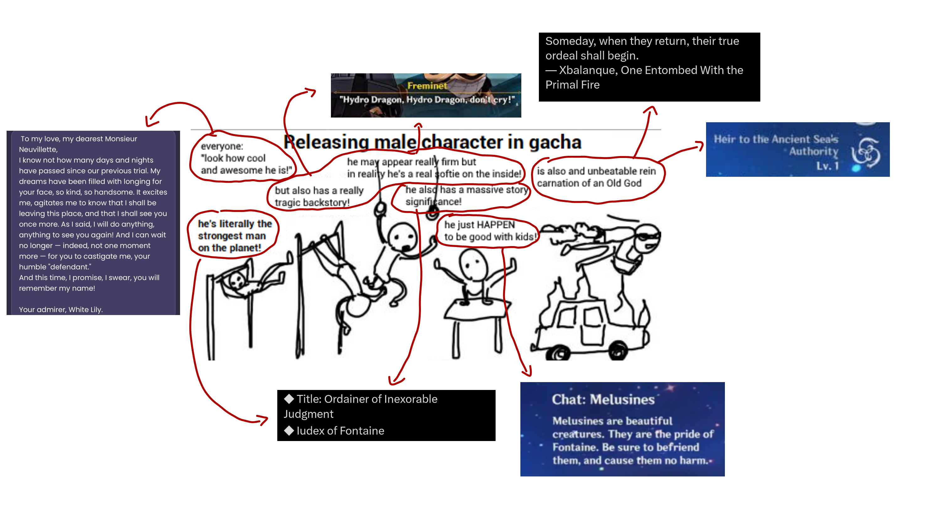 >>561573616>Meanwhile Neuvillette just does fucking everything.>Stopped Cheld, saved Meropide, saved Navia, could read that tablet, is literally the only one who can wield the hydro authority, etc.Hmph. Does everything and can do everything but does fucking nothing after aq besides taking it up the arse from some convict and playing with melusines. Truly the most reactive plot device fodder character of all times. Devs don't even know what to do with him afterwards besides making him the most pathetic piece of shit in the game.