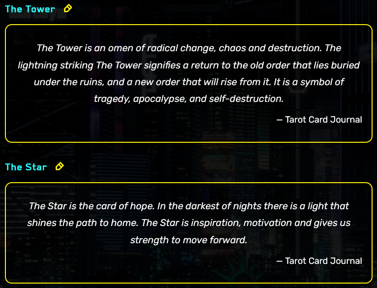 >>561595156V turns into an NPC in the tower, that is literally the meaning of V merging into the crowd. Anything else is fanfic and the tarot card says it's the symbol of tragedy, apocalypse and self-destruction, you chose wrong and you lost. No more chances.The Star is literally the choice of hope.