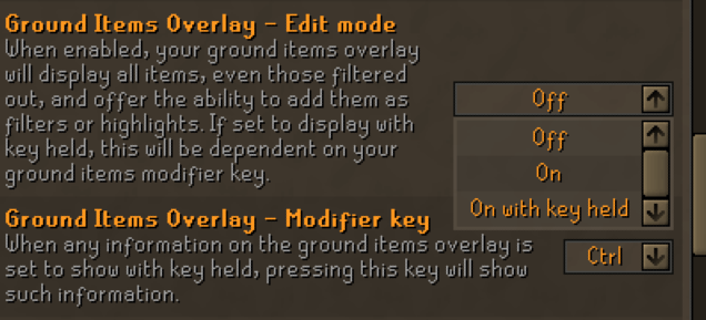 every time i select "on with key held" it flips between on so all items are always visible or off so nothing is visible, is this broken? i just want to be able to tap control to see items left on the ground and their prices without them always showing up. even ignored items show up when on is selected