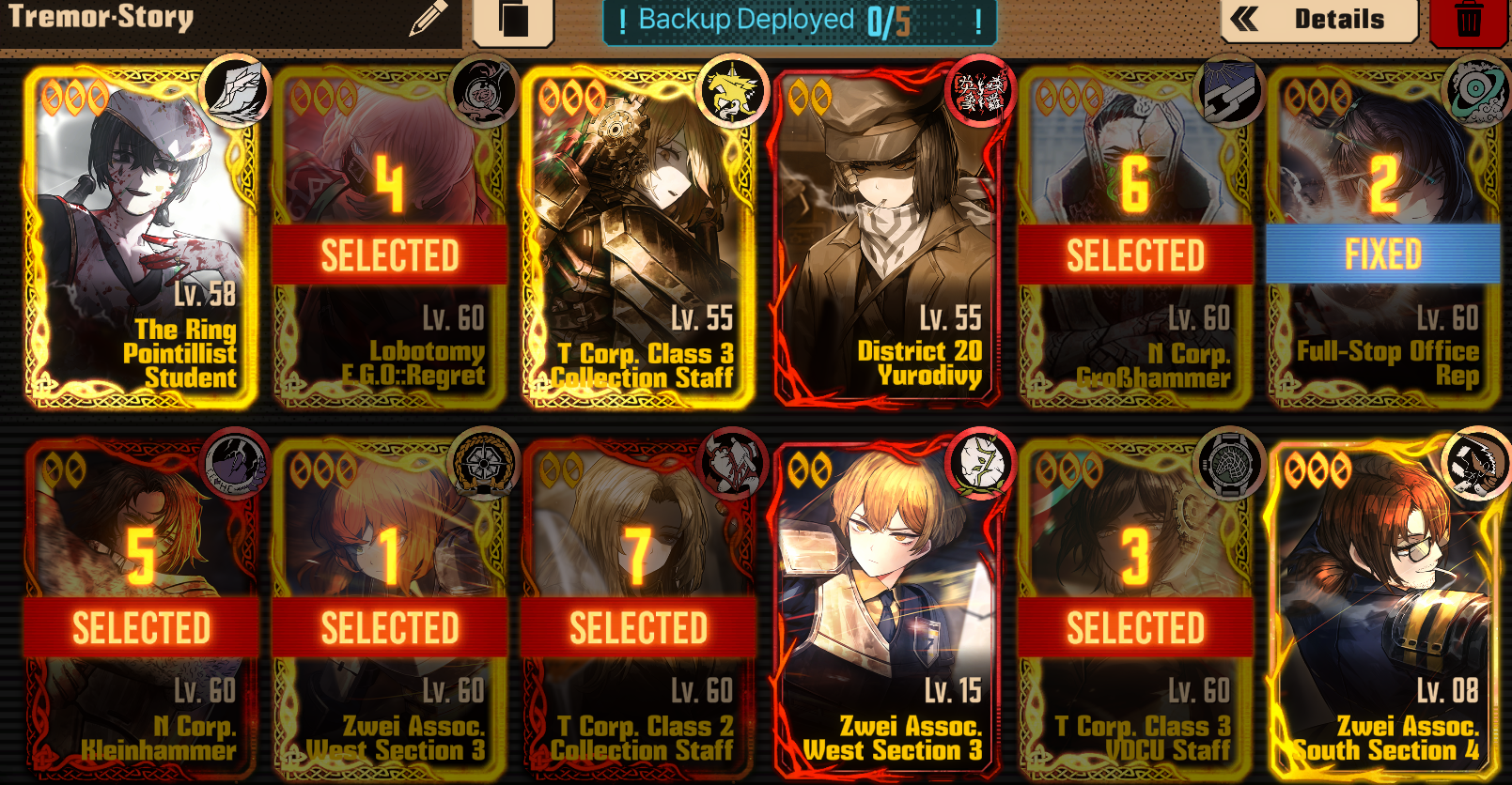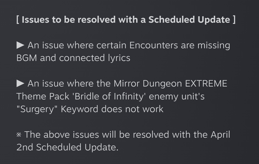 Previous thread: >>561573150Season 7 - Kumo no Ito2025.12.31 —Mirror Dungeon #7 - Mirror of Names and Spiders2026.02.19 —Refraction Railway Line 5 - Merry Go Round2025.02.20 —>Current Events2026.03.19 — 2026.04.16Chapter 7.5 - LCB Regular Check-up BokGak>Current Extractions2026.03.19 — 2026.04.16[000] LCE E.G.O:: AEED Gregor[HE] Ardor Blossom Star Faust2026.03.19 — 2026.04.02Target Extraction: [ Heathcliff ]>FAQs! This game is directly tied to the setting of Project Moon's previous games, Lobotomy Corporation and Library of Ruina, and is set after both. Expect spoilers for those games in this thread.! The tutorial is important.>Download linksAppStore: https://apps.apple.com/app/limbus-company/id6444112366Google Play: https://play.google.com/store/apps/details?id=com.ProjectMoon.LimbusCompanySteam: https://store.steampowered.com/app/1973530/Limbus_Company/>Other linksOfficial twitter: https://twitter.com/limbuscompany_bOfficial youtube: https://www.youtube.com/@ProjectMoonOfficialOfficial site: https://limbuscompany.global>Required readinghttps://mega.nz/folder/xosDkZ5Z#Wt4JpUt5Bb2XG77pxuuXpw>For all your EGO and Sinner info needshttps://soshage.com/limbus/https://gll-fun.com/en/>Useful resources and a general guidehttps://rentry.org/lcg_resourceshttps://rentry.org/lcbguidehttps://rentry.org/LCB_optimal_grind_guidehttps://lcb-days-since-last-id.carrd.co/https://lcb-days-since-last-ego.carrd.co/>Countdownhttps://lcbcountdown.carrd.co/