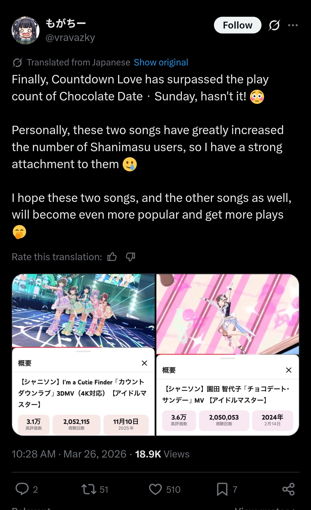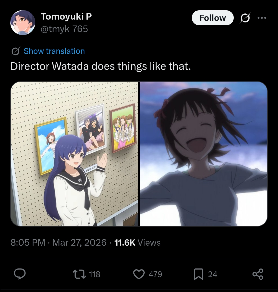 iDOLM@STER ThreadPrevious iM@S Thread: >>561572998Official website: idolmaster-official.jpJapanese news: imasnews765.comEnglish wiki: project-imas.wikiAPKs: apk.ksmz.moeOld archive of materials: sites.google.com/view/yukipobackupOld FAQ + Resource Links: pastebin.com/icRtaLvvMaterial translations + Music downloads: pastebin.com/DebHdukECharacter birthdays: pastebin.com/cLdezeDuNext thread OP: pastebin.com/A5UGxTuBHelpful Links: pastebin.com/Z70CGAsN>Event/Gacha Dates (Mar 20th): >>560923245 >>560923292- Previous News: >>561573014 >>561573039FRIDAY:Mar 27th, 7PM JST: Theater Days Shadow Bout Engage! stream: youtu.be/Eq8VAcxhOik >>560413832 >>560850923Mar 27th, 9PM JST: VL Cosmo's Drawing Stream: youtu.be/-QlDgRqSQGoMar 27th, 10PM JST: iDOL GRAND-PRIX "CAT CROSSING" PV: >>561544835Mar 27th, 11PM JST: VL Cosmo's Members-only stream: youtu.be/yjYzjUFpxngMar 27th: Million Live Anime OVA ~Itsuka, Mannaka de~ BDMar 27th: Gakuen Yorinui Mini Vol.4: >>546474140Mar 27th to Apr 4th: Cinderella Girls x Puzzle & Dragons "Super Godfest" collab: >>561234053 >>561237002 >>561237132 >>561237247 >>561237419Mar 27th to Apr 5th: SideM POP UP SHOP ~Dream Showcase!~ at MAGNET by SHIBUYA109 and JOL Collab Store: >>557732251 >>560823189Mar 27th to Apr 5th: Shiny Colors x Darts Hive Pop Up ShopSATURDAY:Mar 28th: THE IDOLM@STER 20th Anniversary Piano Collection: >>561427901Mar 28th/29th: Cinderella Girls x RASCAL collab at CHUGAI MINING booth in AnimeJapan 2026: >>558430425 >>559996003 >>560078710
