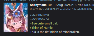 >>561630541You know, Amiya is truly the perfect mascot character.>She’s obsessed with (you)>Is basically your daughter so activates parental instincts>appeals to lolicons>appeals to groomers>(you) can pretend she grows up to be your wife if you’re into that>(you) can keep her as just your daughter/ little sister if you’re a normal person>solid simple design that is easy to draw>looks good in anything more or less>Isn’t a threat to any ship but very shippable>isn’t as annoying as say Paimon or other mascots >Doesn’t show up in everything (in game anyways) so you don’t get sick of her>inoffensive personalityThey clearly tried to replicate her with bird from Endfield but failed miserably.