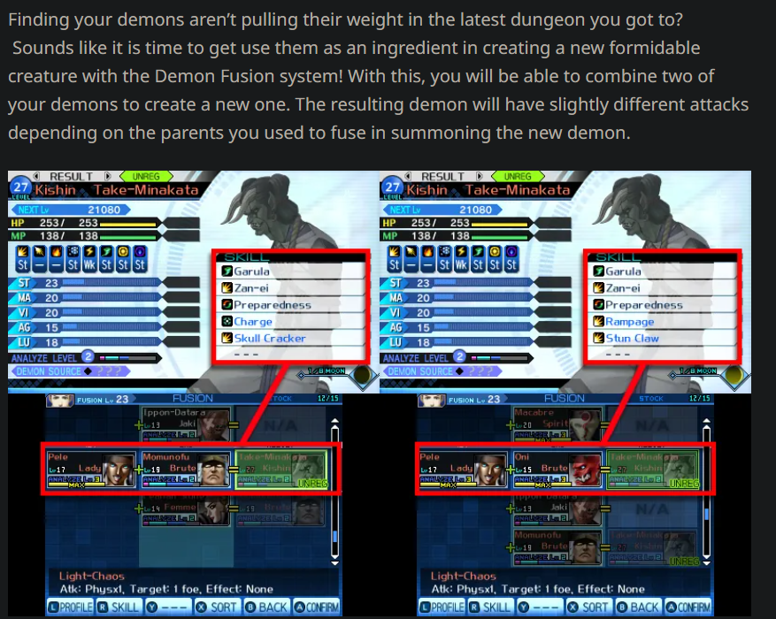 >>561637324PS1 version is kind of the "definitive edition". It fixes bugs, changes the balance to be harder to exploit and it adds small bits of new content. Not the "vision scenes" like in GBA though that give lore details, GBA came after so it has those. It also updates all the visuals so it kind of has a 3D-ish look that looks somewhat better than the original SNES release. I prefer playing it over SNES unless I want to play an SNES game. IIRC there are other differences but it's the best version IMO.Neutral does make you fight both Law and Chaos bosses iirc, I don't remember SMT I having specific Law/Chaos content outside of tiny aspects.>>561637587Yeah it was translated, though the guy that translated it did it pretty differently from Aeon Genesis who translated SNES. You'll notice a lot of terms and demon type names use different words and names.>>561646491I just noticed she's wearing both the SNES and PS1 outfits, nice touch. I always preferred Kaneko's older artstyle, but the newer outfit designs and such are better.