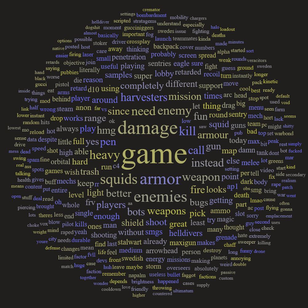>>561714739>tedious as in?nerfdart weaponry with the 4 decent options for heavies being nerfed almost immediately, you played on release, you should knowweapons are good now, there's alot of options, most enemies got changed or nerfed in some way that makes them very easy to deal withprimaries range from "still better than release spray and pray" to "can solo a whole faction"