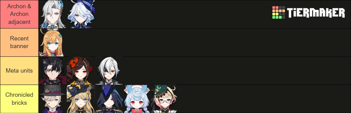 >varka - useless brick>linnea - fillerslop hebe for a geo character most people skipped>nicole - insanely boring in every way, glued to bricka, will flop hard>lohen - fillerslop standard brick>purple nahida - fillerslop 4*What the fuck were they thinking here? Did they really just expect "HOLY FUCK IT'S MONDSTADT!!!!!" to sell an entire patch cycle of shit characters?