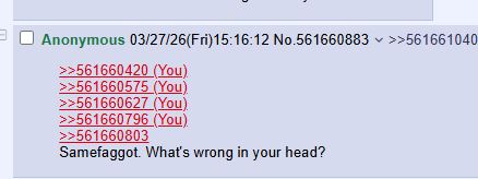 >>561660420>>561660575>>561660627>>561660796>>561660803Samefaggot. What's wrong in your head?