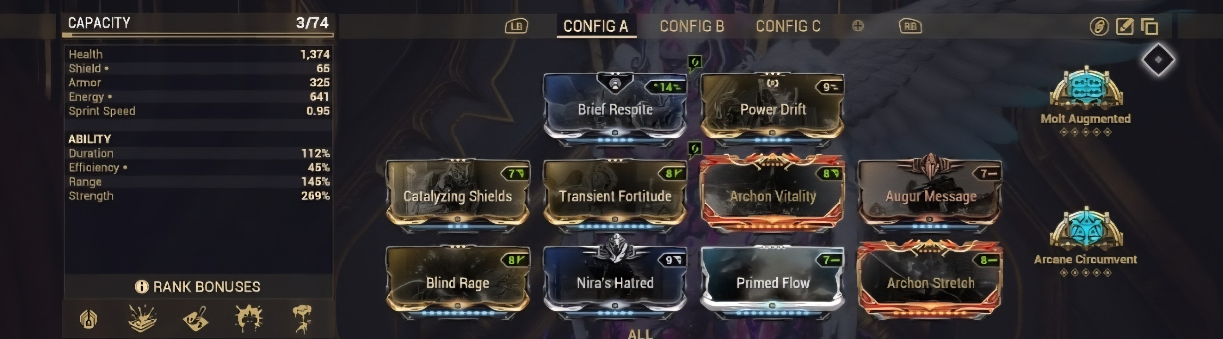 >>561673801I don't get why people dislike the idea of running equilibrium. You pretty much HAVE to run equilibrium, nourish, or energize. You pick the one you want to sacrifice for energy economy, and IMO sacrificing a mod slot is much better than sacrificing a helminth or arcane slot.
