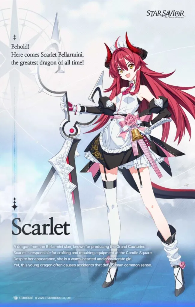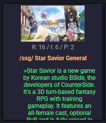 >Star Savior is a new game by Korean studio BSide, the developers of CounterSide. It's a 3D turn-based fantasy RPG with training gameplay. It features an all-female cast, optional PvP and is voiced in Korean and Japanese.https://www.youtube.com/watch?v=iSAUnYJX3-Qhttps://www.youtube.com/watch?v=j9N0Y11H9oY>Downloadhttps://store.steampowered.com/app/3609080/StarSavior/https://play.google.com/store/apps/details?id=com.studiobside.starMainhttps://apps.apple.com/app/id6443597557>Reroll Guide and Beginner's FAQhttps://tychara.com/StarSaviorhttps://docs.google.com/spreadsheets/d/1W1nl3zfBdrgNCjLCVt7lBn0UzuwPLVnF2JkC4iamRic/edit?gid=1473713484#gid=1473713484>X/twitterEN - https://x.com/StarSavior_ENJP - https://x.com/StarSavior_JPKR - https://x.com/StarSavior_KRSite: https://starsavior.com/en>Daily Check In- Special Welcome (SSR selection, SSR Trish)- New Savior Party (14 days, SSR Frey, tickets each day)- Lavistar Settlement (21 days, SSR random box)- Global Launch (? days, SSR Roberta)>Resethttps://time.is/1900+UTC>Banners[02.04. - ??.??.] SSR Rate Up - Rosaria[19.03. - 01.04.] SSR Rate Up - Yoo Mina[19.03. - 01.04.] SSR Rate Up - Hilde[19.03. - 14.04.] Special Featured Observation (Post KR/JP launch Saviors/Arcana)>Events[19.03. - 08.04.] Vestige of Corruption I - The Monologue Must End (CounterSide Collaboration)https://www.youtube.com/watch?v=ja8yRx3zf3A>Resources:https://kanohban.github.io/StarSaviorArcanaDB/https://rentry.org/ssgguide>Guilds:ScarcityLummiesLuckletsHildfriendsHuldraPrevious:>>561614873