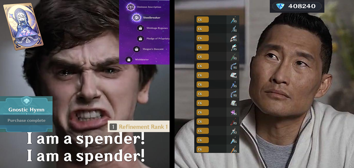 >CHARACTER is actually meta and very good!! They have been buffed by X and Y, just look at this Miliastra dummy screenshot!If CHARACTER is meta, then why is no one using them in the endgame game modes?>W-well it's because the current abyss and SO doesn't shill their element and-So they aren't meta?>NOOOO CHARACTER IS DEFINITELY META THEY JUST CAN'T SHINE RIGHT NOW LOOK AT THIS DPS CHARTThen why is no one using them for the raw damage checks?>Well it's because they can't quite reach the DPS needed to defeat the shill boss of the newest char-So they aren't good>NOO it's because they're still waiting for their final support who will come out in three patc-If they need a third support and a team comp intended for a different character, aren't they just the weakest link in the party?>NOOOO YOU DON'T GET IT LOOK AT MY DUMMY SCREENSHOTS LOOK AT THEM AAAAA'Hexerei will buff Klee' fags never recovered from this btw