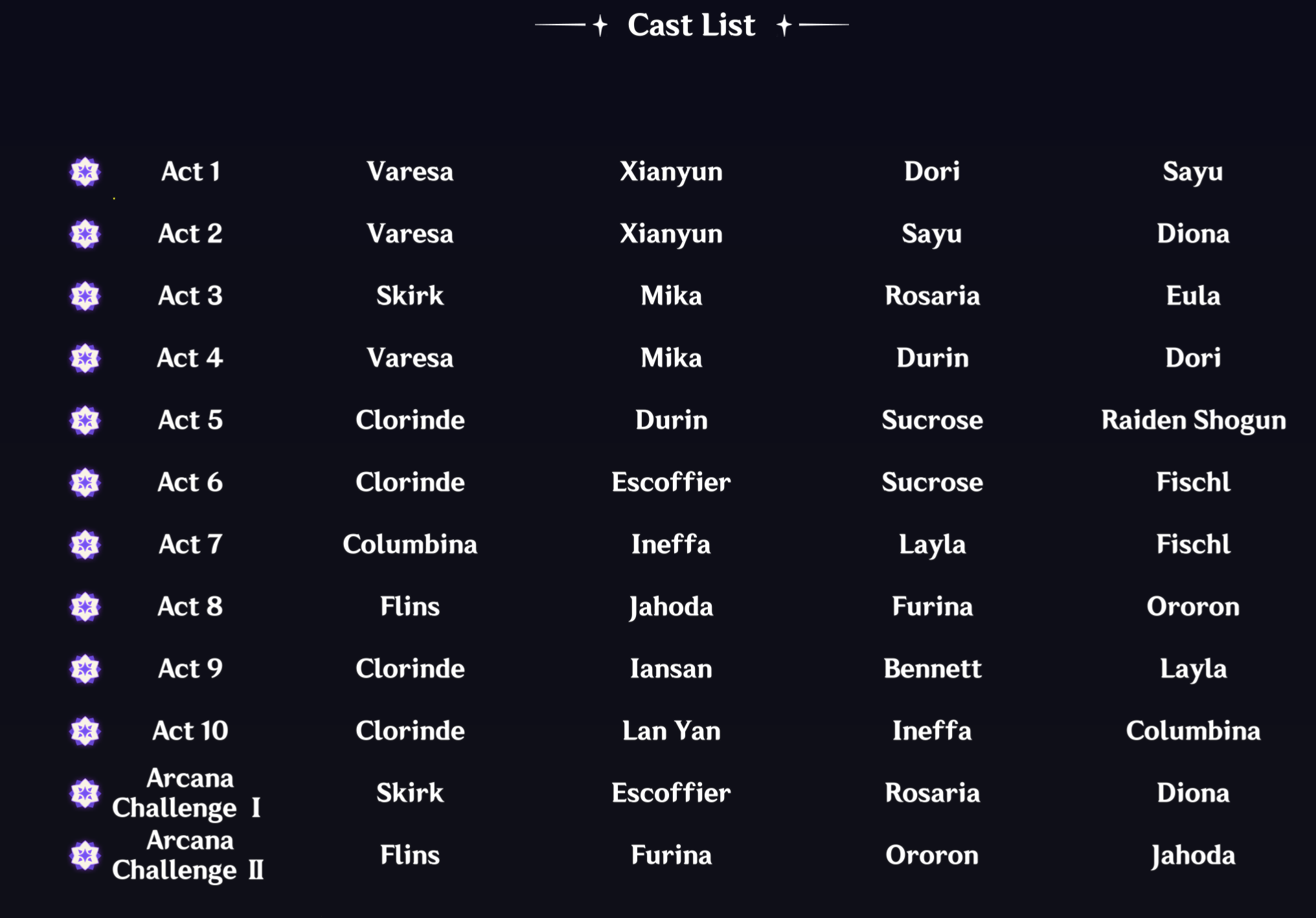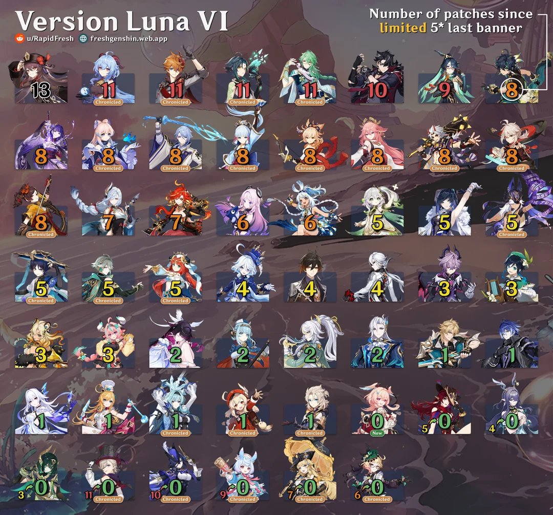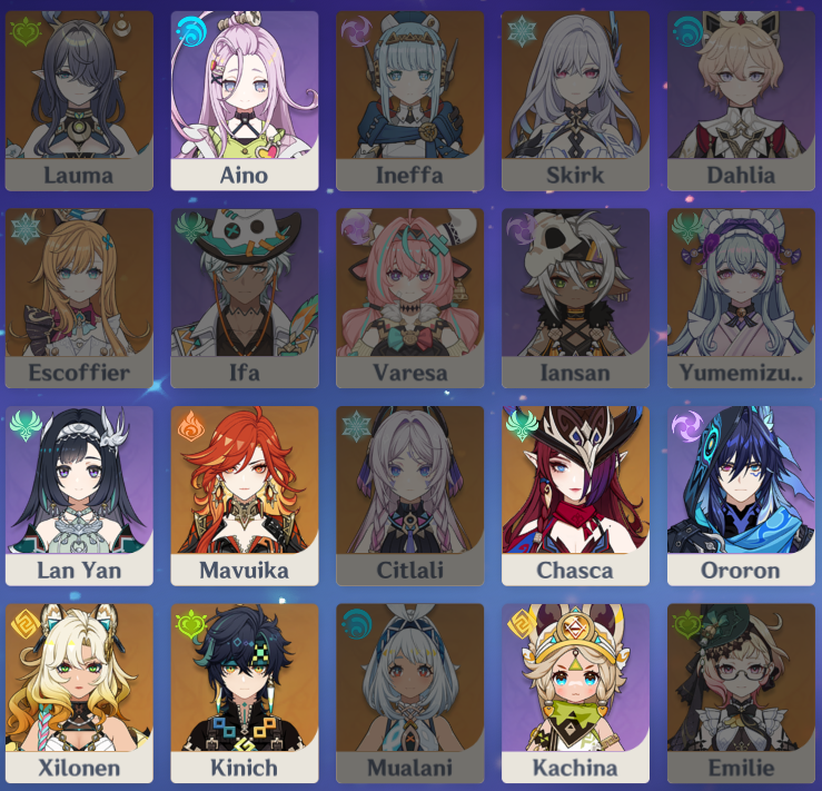 >1.6Barbara>2.8Mona>3.8Kokomi>4.8Nilou>5.8MualaniEvery summer event has had one of the hydro girls in its castNod-Krai's summer event will feature Furina or Columbina. In fact this would probably also line up with the time where it would be time for Columbina to get her first rerun