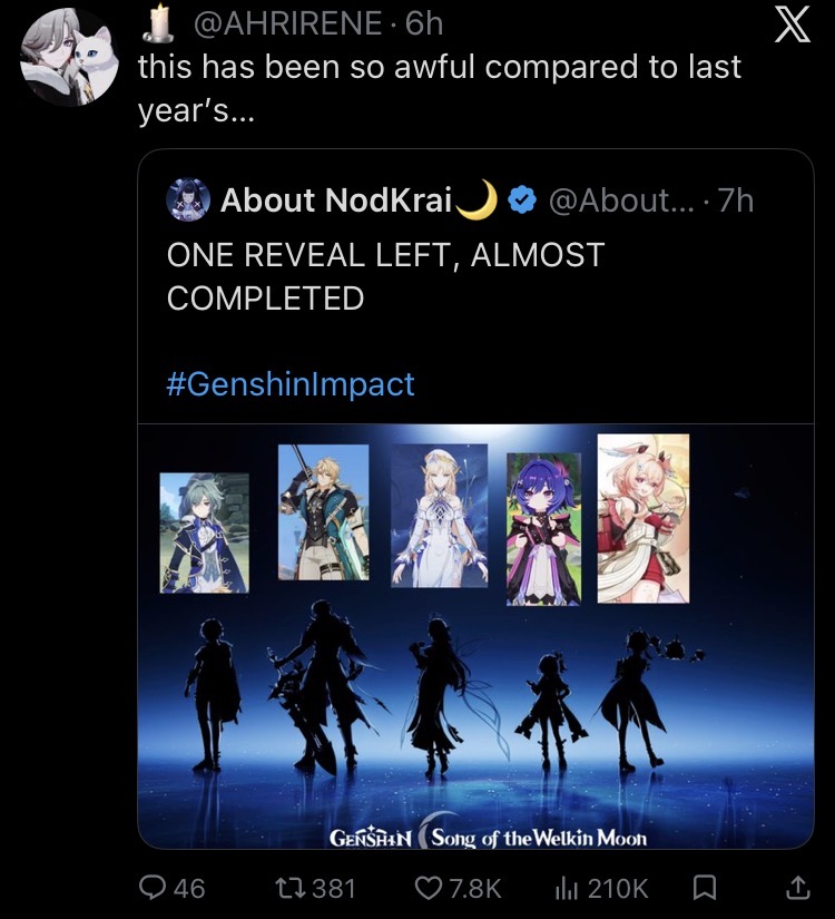You ever notice how after Genshin streams people always complain about "why did they do X instead of X" or just general disappointment when after HSR, ZZZ, or WuWa streams people are always excited about what is coming and never question why something is the way it is?Why is that?