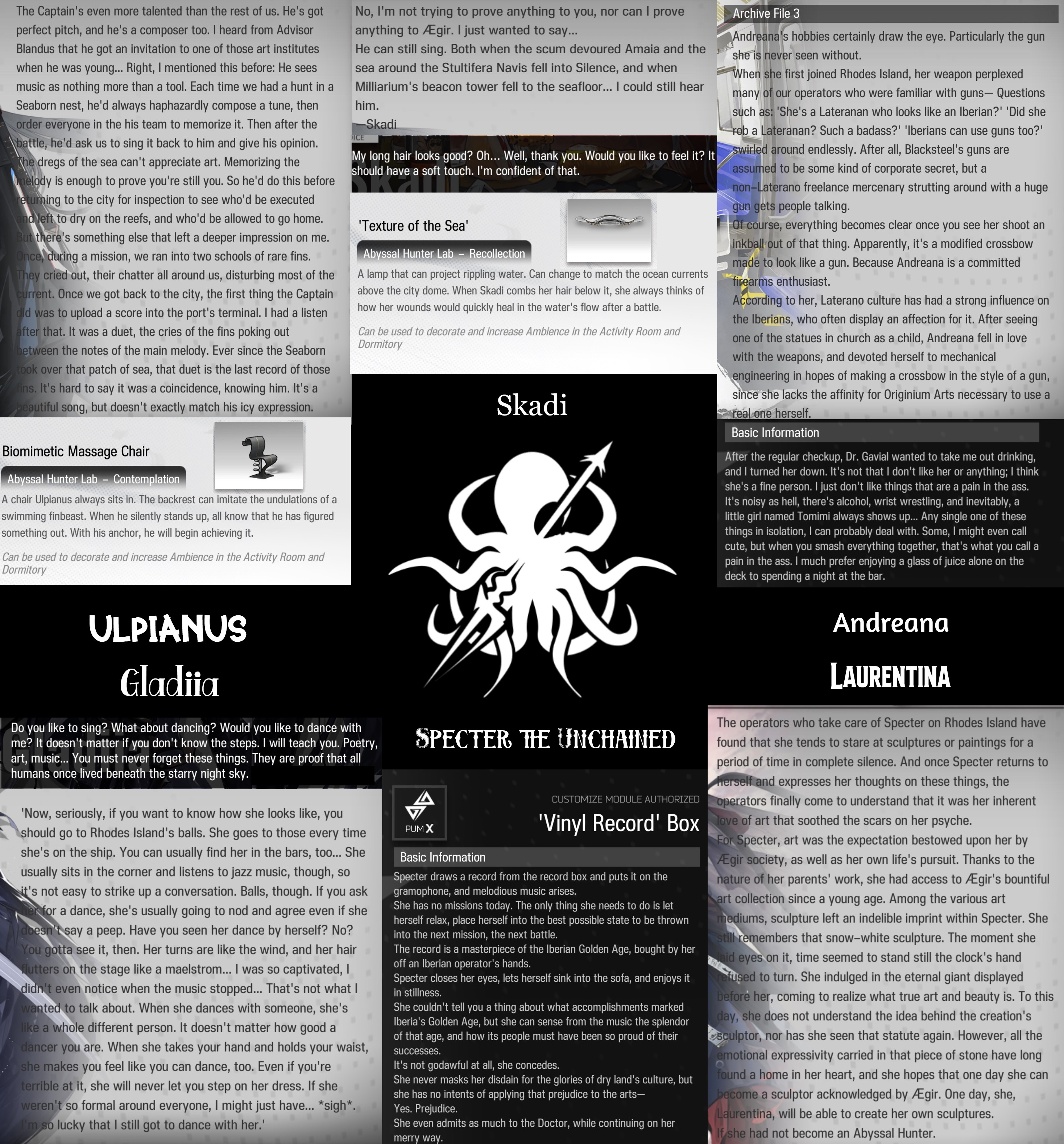 >>561687421Specter2's record is the best for this as it's literally her putting together the pieces of who she is in real time by doing stuff, and a core part of her theme and character is enjoying life and art>singing with Skadi, dancing with Gladiia, musing over art (by staring at rocks and imagining sculpting them), flirting with IreneAnd then Specter in particular reallllly enjoys combat and one of her modules is listening to Iberian music, and Gladiia can be found in bars and will apparently dance with just about anyone in the Rhode Island balls that it can be assumed other hunters go to as wellIrene also specifically recommends Iberian music and looks forward to the balls too, so that's cute