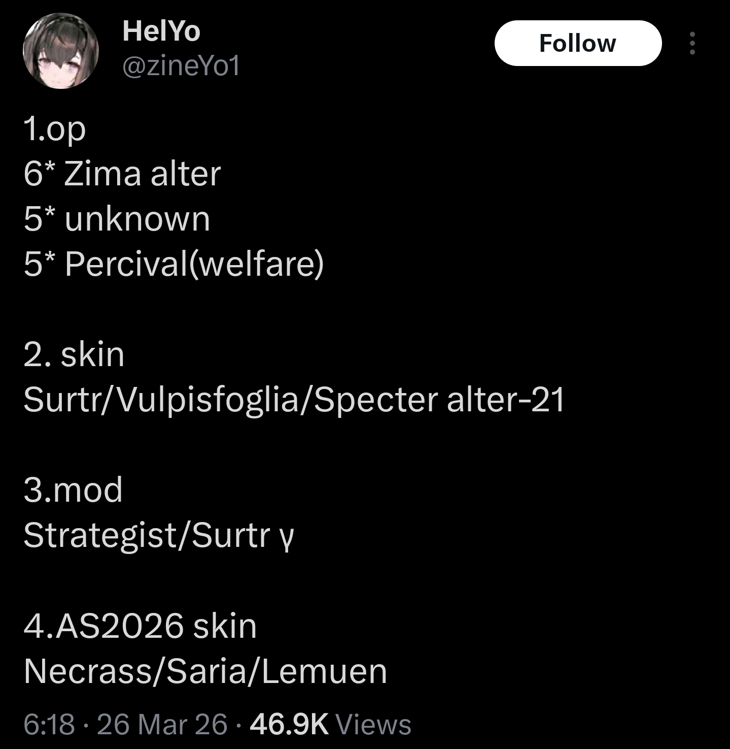 >>561727346If I were them I'd make a collab like that a priority as soon as they've figured out who the fan favorites of that game are. Seems like a smart decision. But I also would have put the Ex Astris gals in so.I've also been thinking it'd be funny if they added a recov-whatever to Endfield that doesn't exist in AK yet and then added them here afterwards