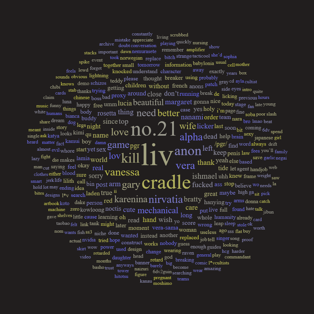 >>561795804Thats right everyone, No.21 is my wife, it was obvious I know but its good that even the Word Cloud knows now.